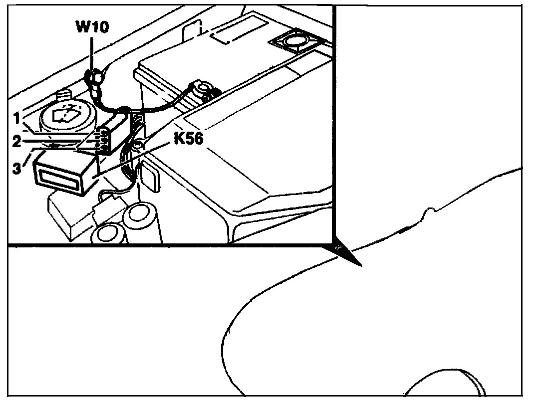 Connect multimeter to pin 3 (c. 15) on crash shut-off relay connector and battery ground W10. Nominal value: 11 - 14V