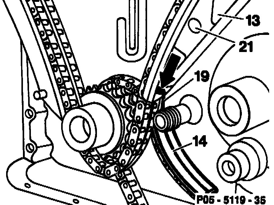 Tensioning spring (19), tensioning rail, oil pump chain (14):