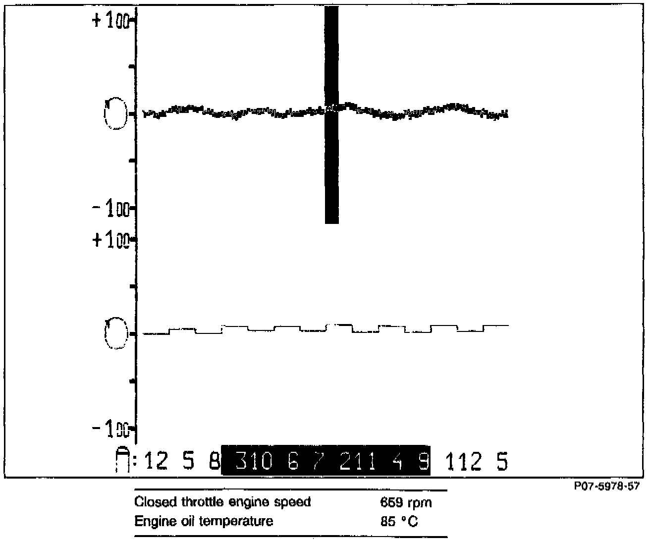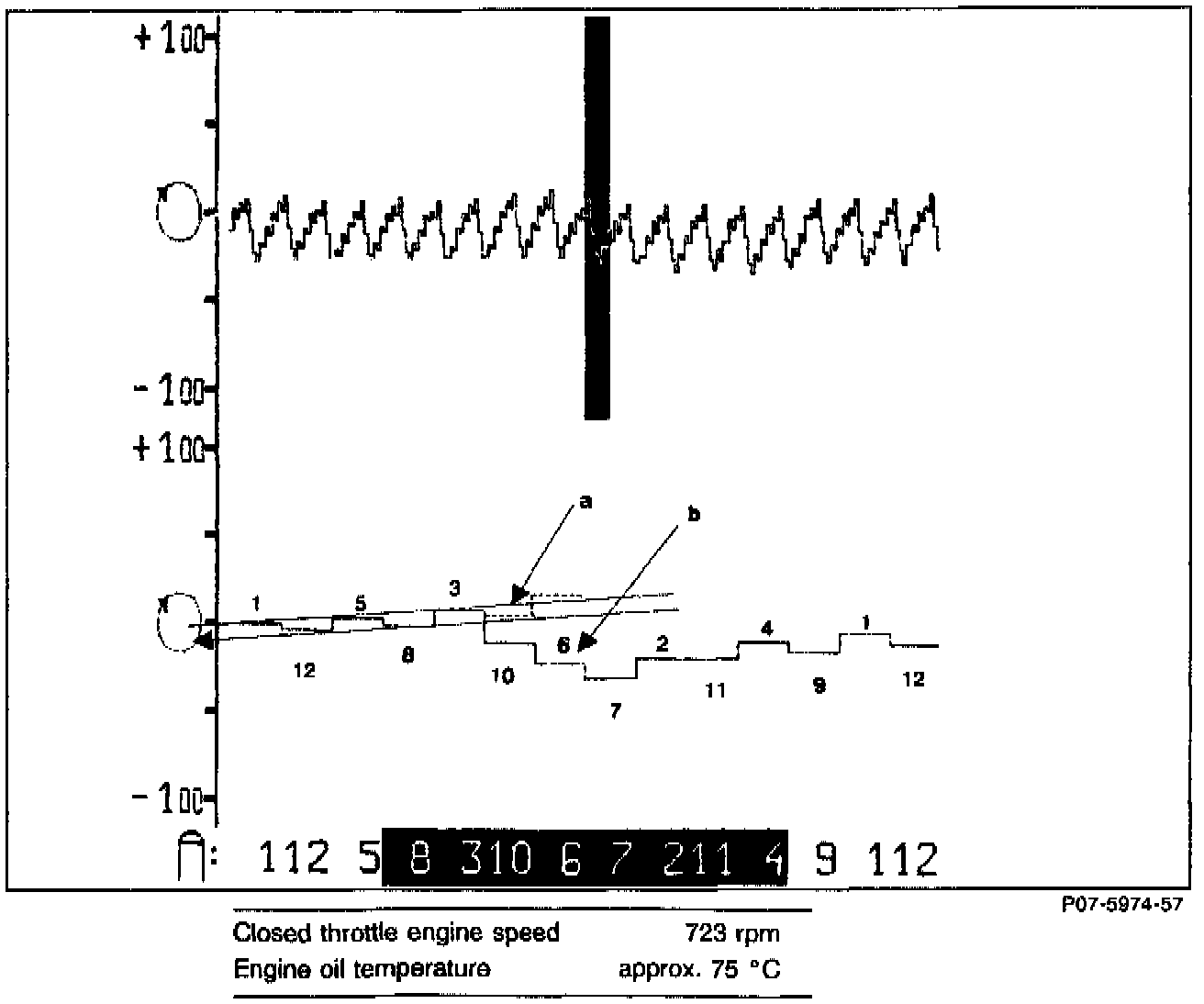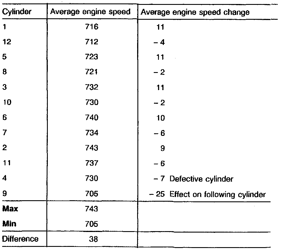 The "Engine Speed per Cylinder" table clearly shows that the cylinder with the lowest engine speed is the weakest. As a result, the measured value is well suited as a confirmation in cases of frequent missing which can not be identified with certainty by use of the engine speed graphic example.Since these values represent an average of individual values, intermittent missing can not be identified. Intermittent misses can only be identified and evaluated by means of the sample graphic illustration.
