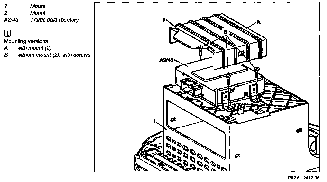 8 Unclip mount (2) from traffic data memory (A2/43) and remove traffic data memory
