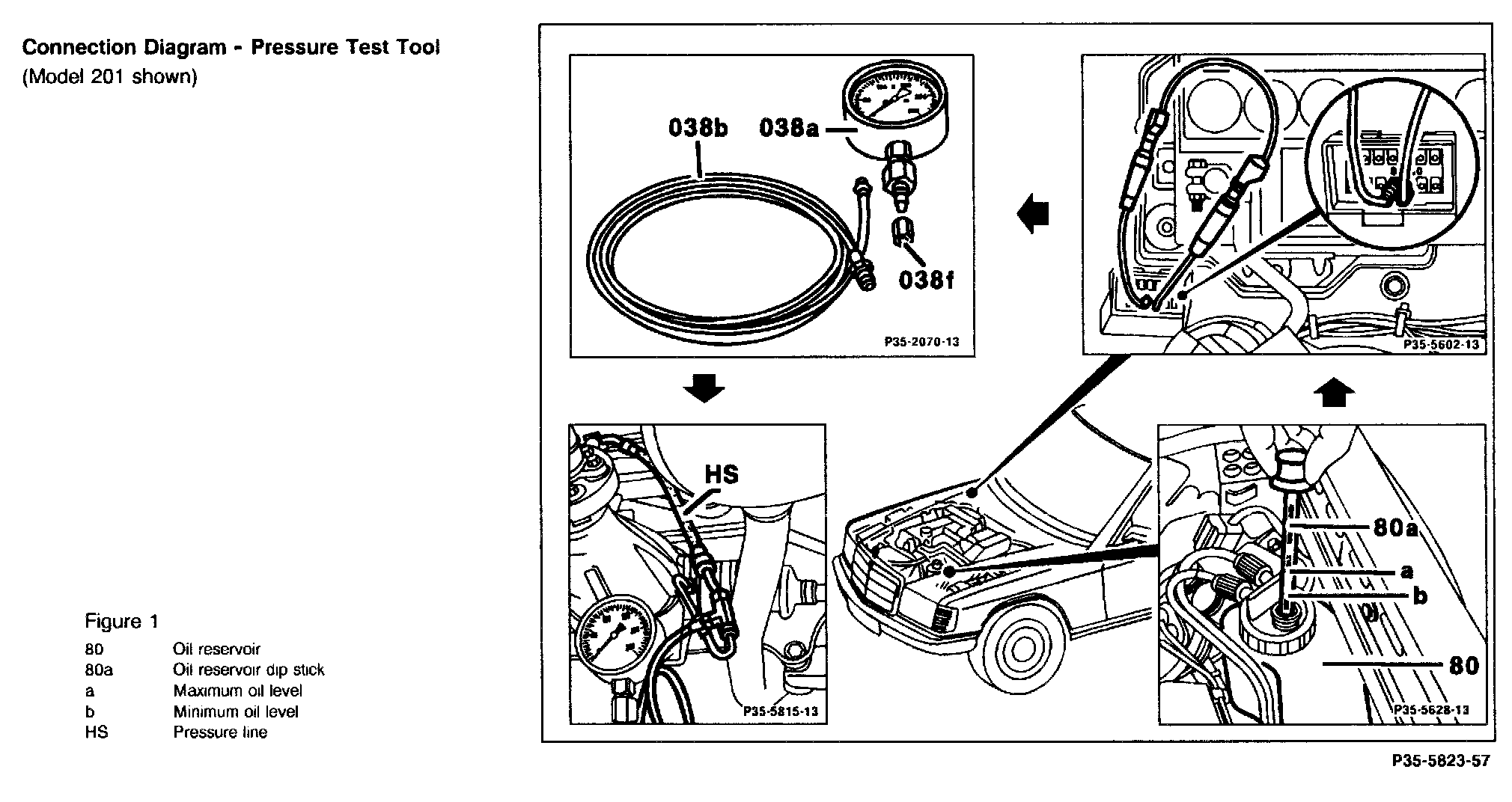 Note: Depending on acecssibility, the pressure test tool can installed on either the right vent screw or the left "HS" line.