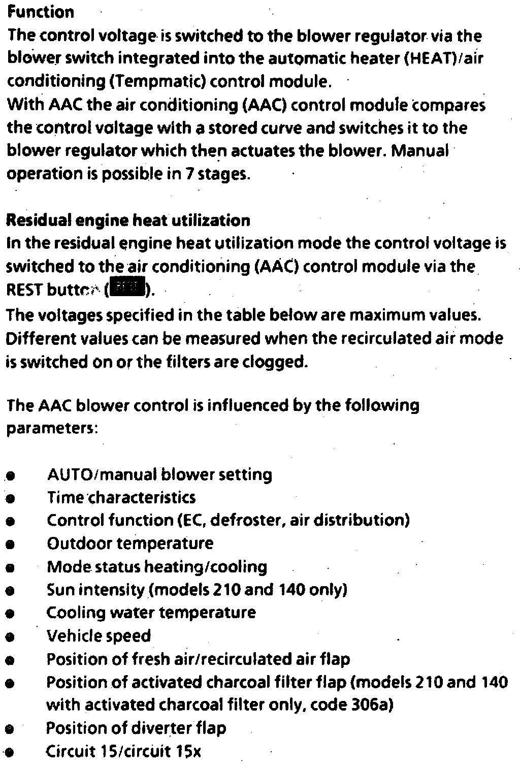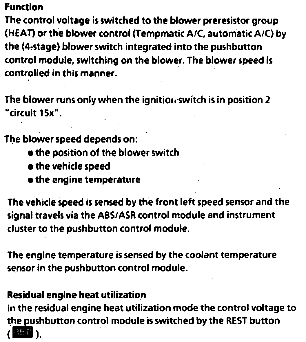 In the fresh air mode the blower sucks fresh air in through the fresh air flap; in the recirculated air mode air is sucked through the recirculated air flap from the vehicle passenger compartment into the heater or air conditioning housing. In the residual engine heat utilization mode the blower circulates the air in the passenger compartment