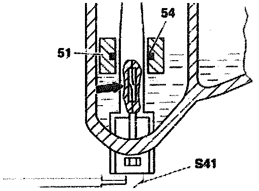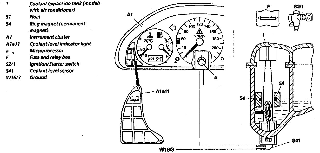 - When the coolant level drops, the float (51) moves down. When the ring magnet (54) is positioned above the contact (arrow in the coolant level sensor, the contact closes.