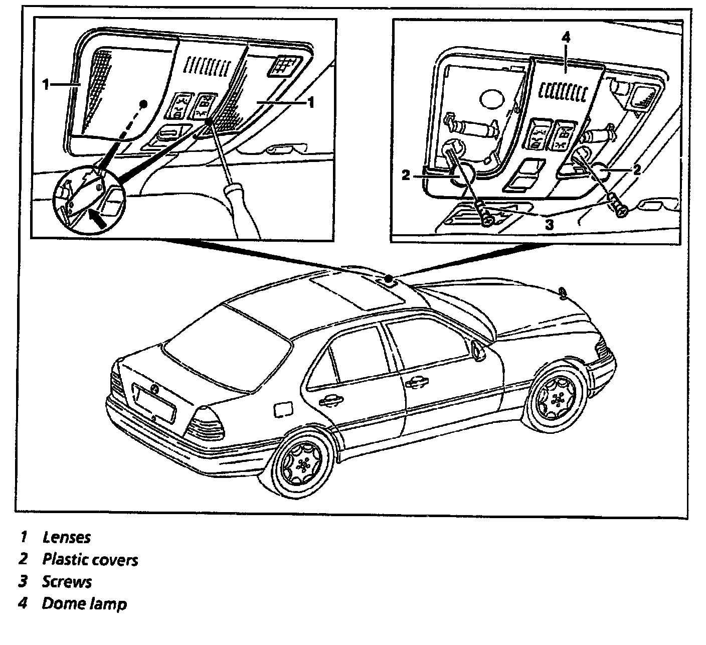 1. Lever off lenses (1). Pay attention to mechanism for levering out parts between dome lamp lenses.