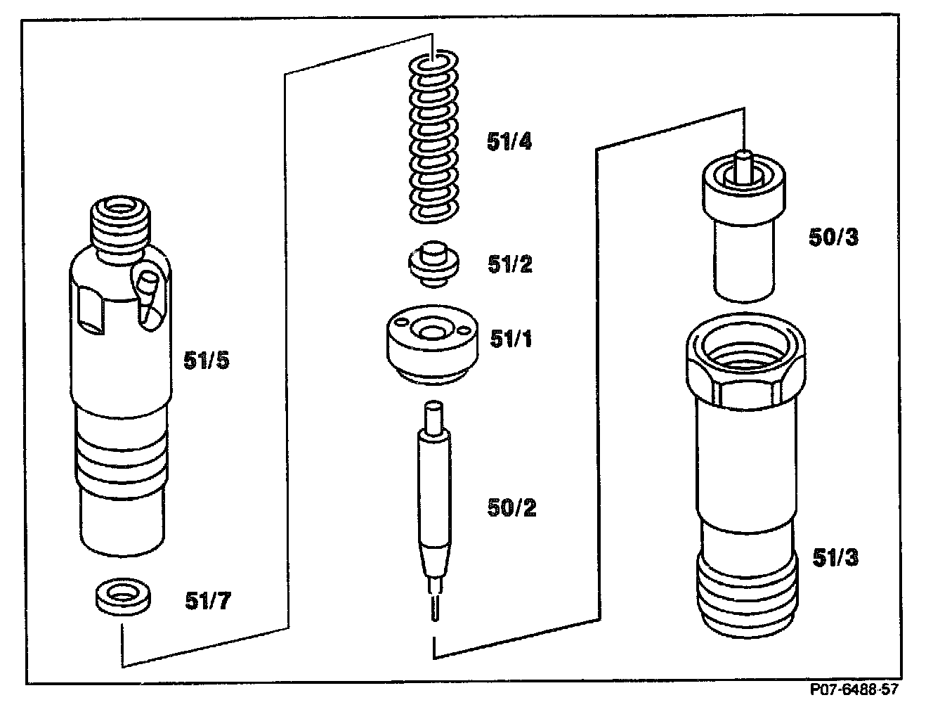 Remove nozzle needle (50/2). Perform visual and sliding check. To do this, immerse nozzle in filtered diesel fuel. When nozzle body is held upright, nozzle needle must slide down toward nozzle seat as a result of its own weight. If damaged, replace nozzle needle (50/2) and nozzle body (50/3) only as a set.