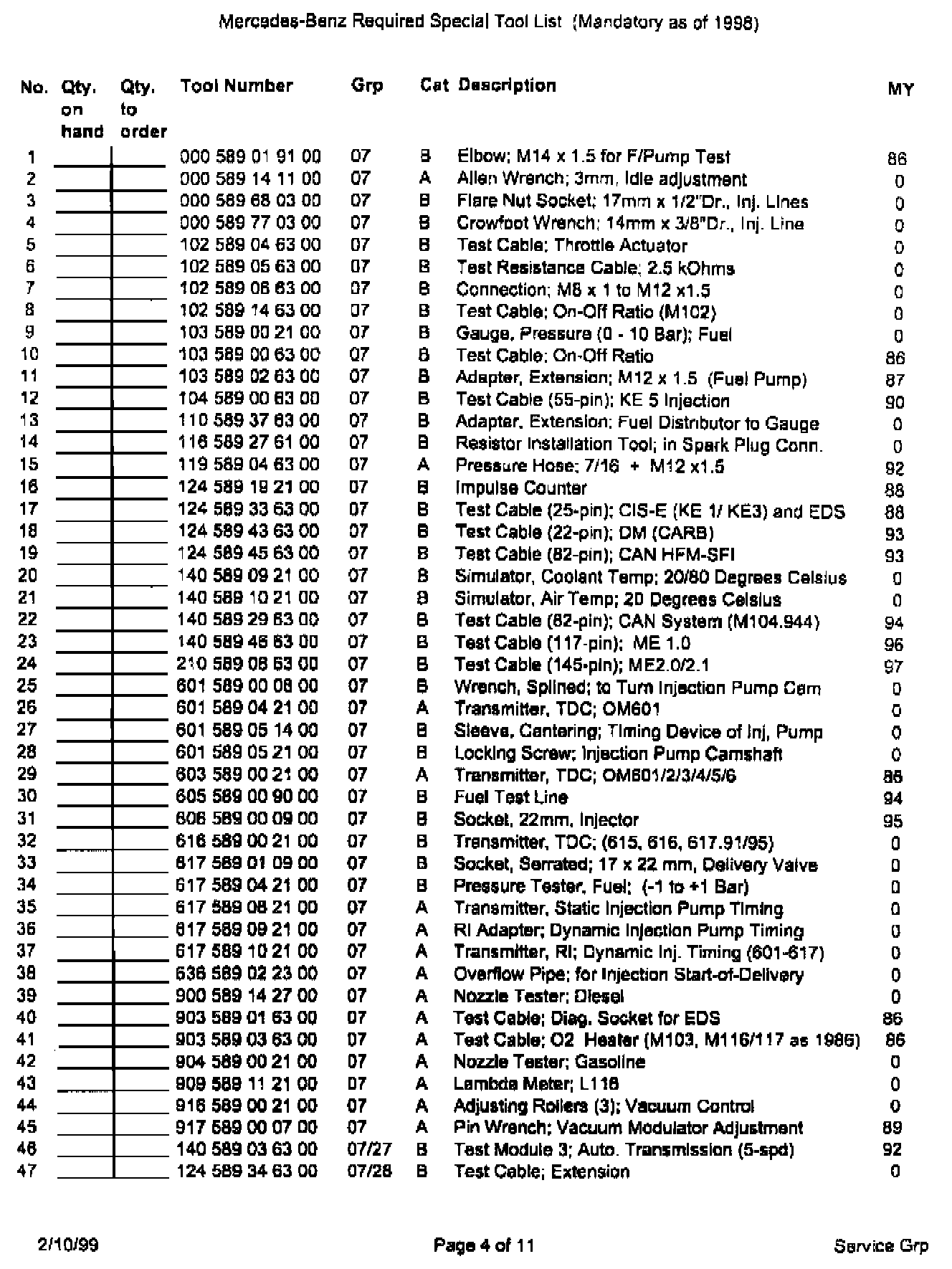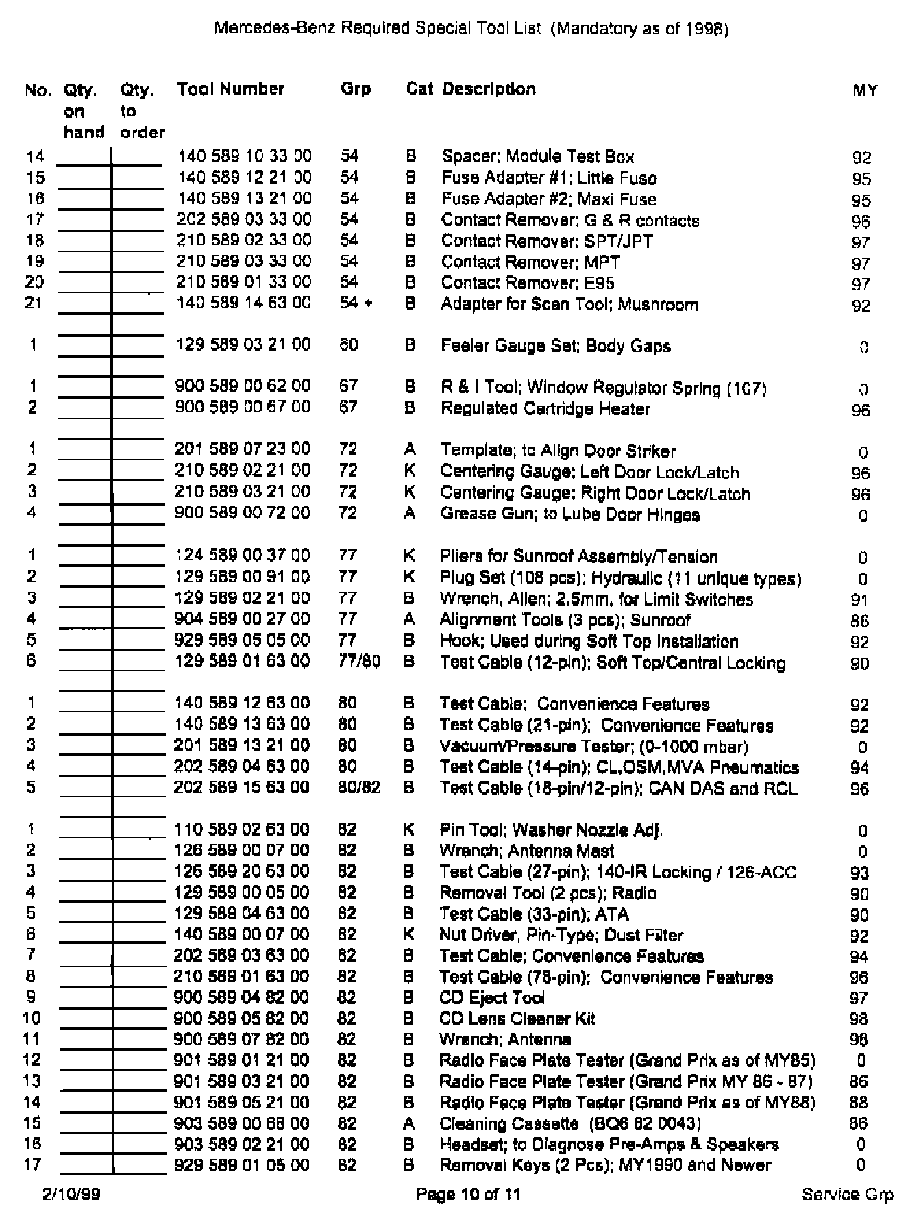 Included is a copy of the MB-Special Tools for Passenger Vehicles Inventory list, which has been updated to include the current MB-Special Tools, category A & B (and an occasional category K), required for the service, repair and maintenance of Mercedes-Benz passenger vehicles. This listing is current up to and including Model Year 1998. Market Managers and Service Operations Managers will receive five (5] copies with this bulletin. The inventory list must be completed when preparing a package for a prospective dealer, buy-out, relocation or reorganization. It's review is included as part of the Mercedes-Benz Standards Dealer Review for all existing dealers. The list documents inventory status and acts as a worksheet to determine which tools the dealer needs to order directly from his facing PDC via MB-Net. However, new Model Year category A & B tools will continue to be distributed automatically.