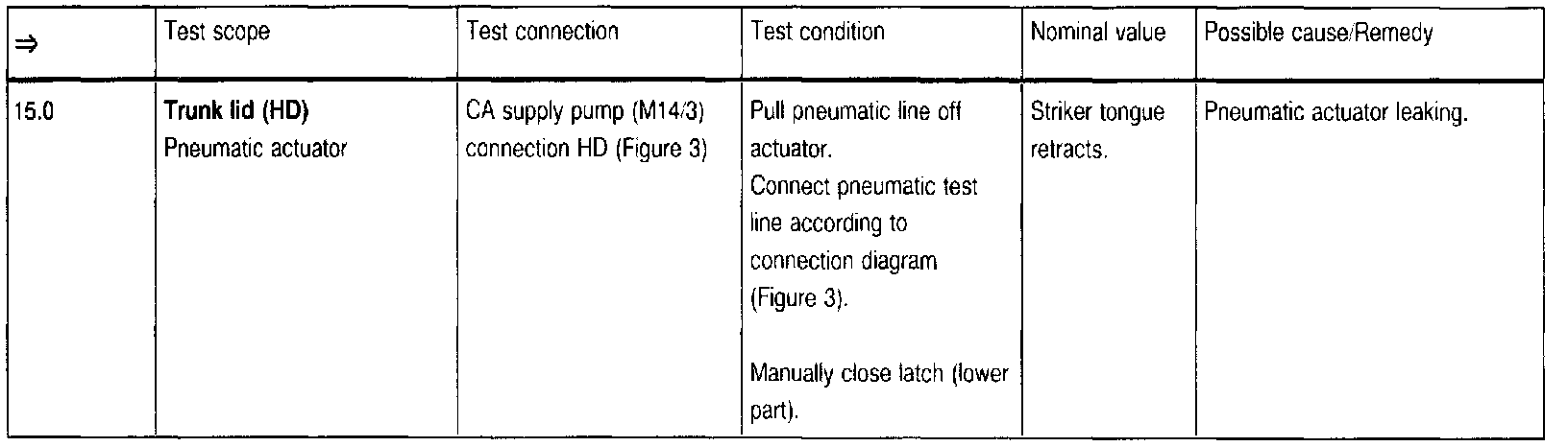 NOTE: AS of chassis end number 118121, pressure or vacuum for the lock striker actuator is applied in parallel with the retractable trunk lid grip actuator. If during diagnosis, the retractable trunk lid grip actuator and pneumatic line are determined to be leak-free, be certain to check the multiple connector (3) and lock striker actuator (2) for possible leakage as well.