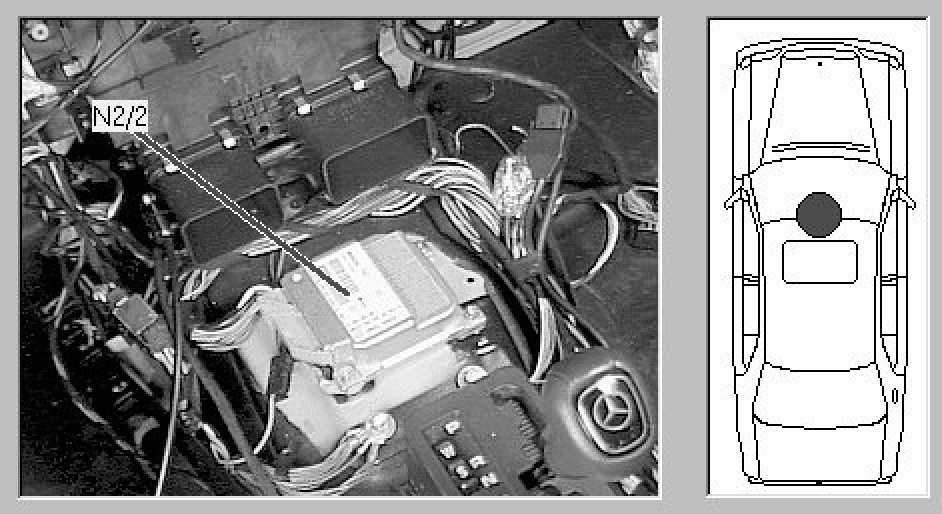 Passenger compartment, beneath front of center console, on transmission tunnel forward of shifter assembly.