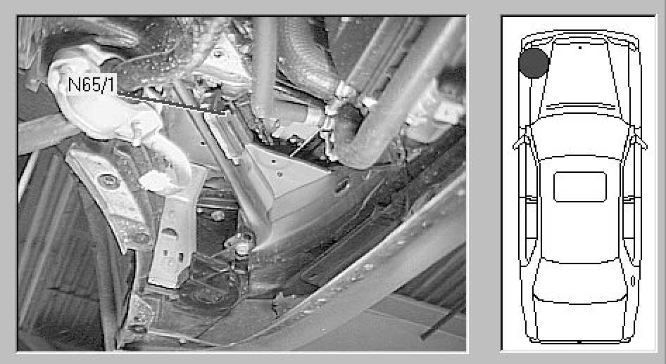 Beneath vehicle, left front of Engine compartment, on inner side of left frame rail.
