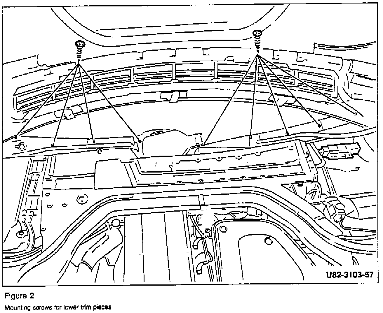 Cracks at the bottom of the windshield may be caused by excessive pressure placed on the glass (b, Figure 1) by the lower trim pieces (d) as their screws (Figure 2) are tightened. This pressure can lead to stress cracks starting at the bottom of the windshield.