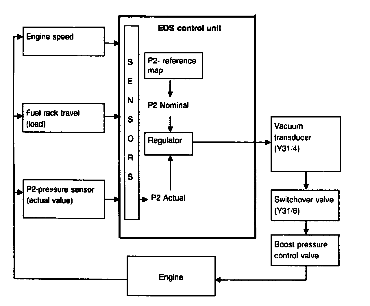 The EDS control unit contains a closed loop circuit which compares pressures "P2 actual" with "P2 nominal" (see block diagram).
