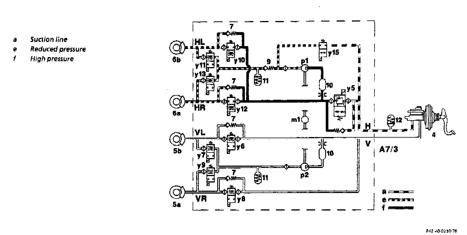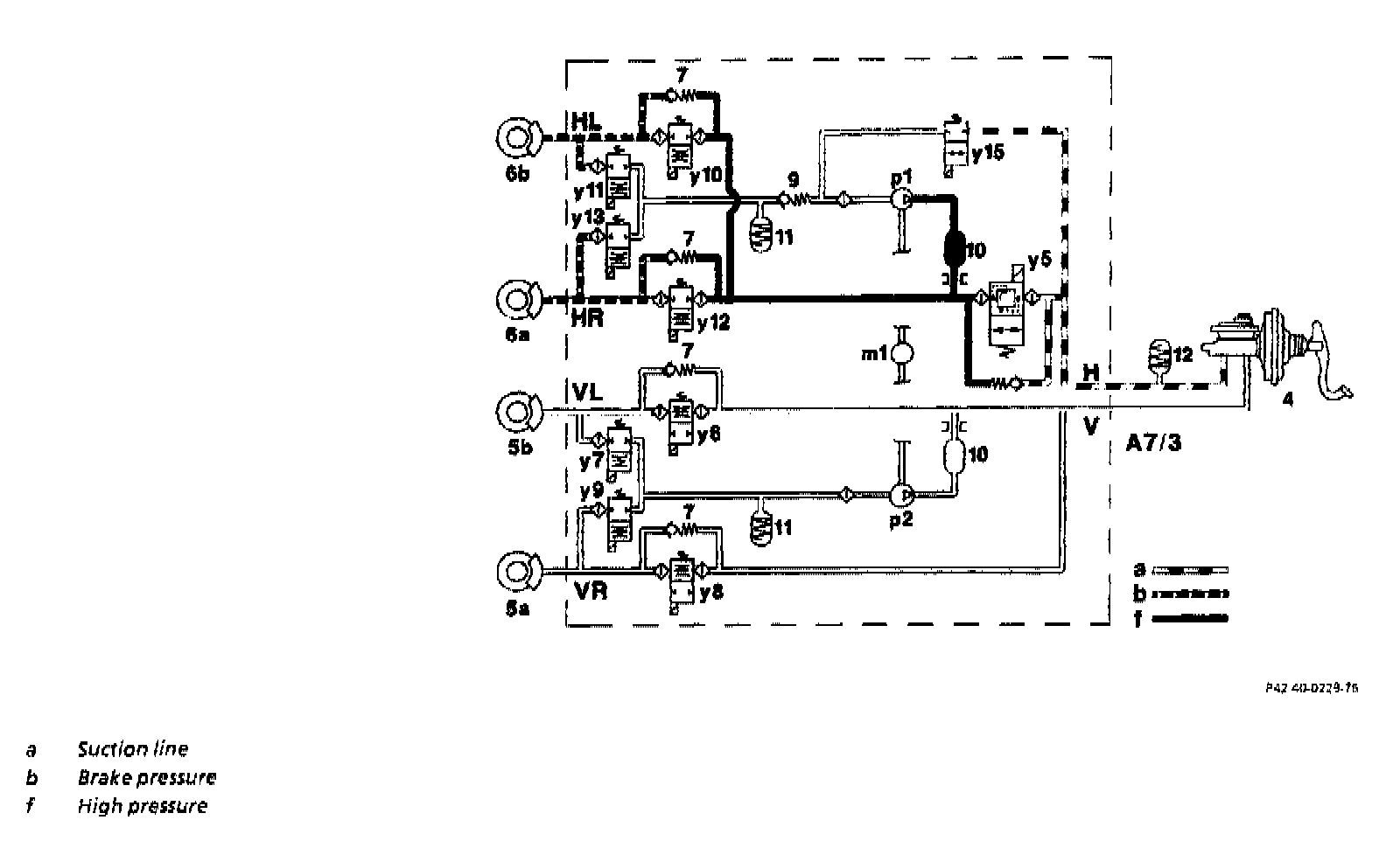 The inlet solenoid valve (y15) is continuously open. The pressure to the rear axle brake calipers is build up via the self-priming high-pressure/return pump (p1) via the solenoid valves (y10, y 12; not actuated - open).