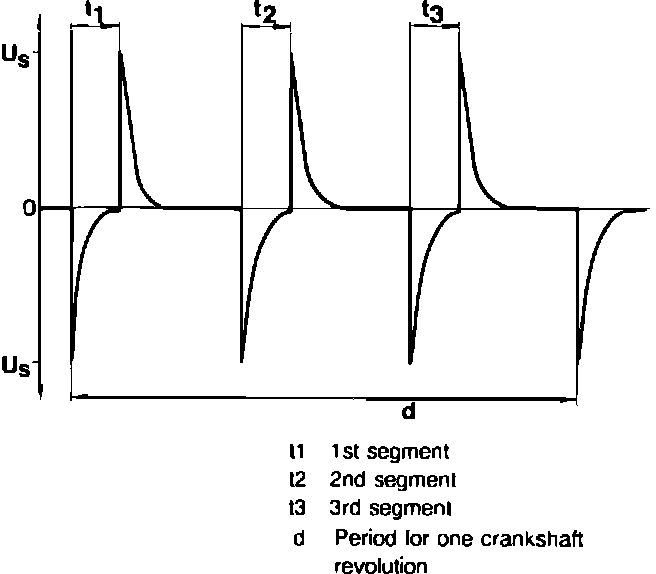 The crankshaft position is recognized from the voltage signals which are produced. The segment front edge generates a negative voltage signal. The segment rear edge generates a positive voltage signal. Engine speed is determined by measuring the period (d) which is equal to one crankshaft revolution.