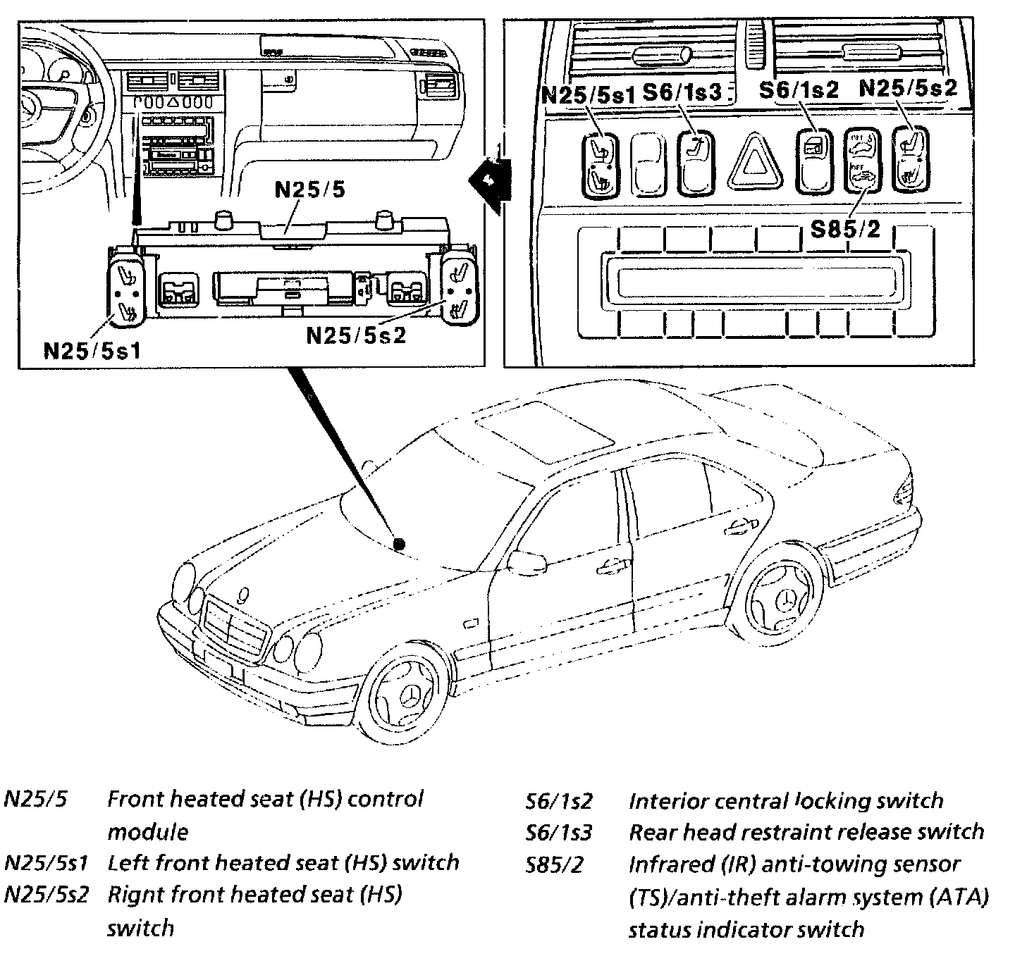 The automatic heating sequence is terminated when the ignition is switched off (position 0). When the ignition is switched back on it is necessary to press the heated seat switch (N25/5s1, N25/5s2) again.