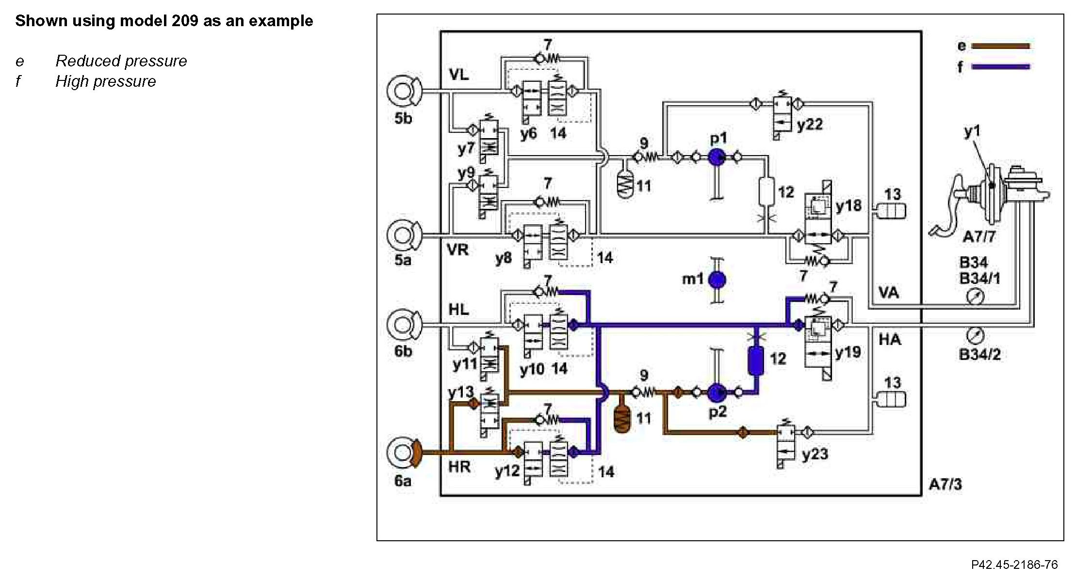 The brake fluid flowing back returns to the brake fluid reservoir via the rear axle pump (p2) through the pressure limiting valve integrated in the rear axle switchover solenoid valve (y19) via the master brake cylinder.