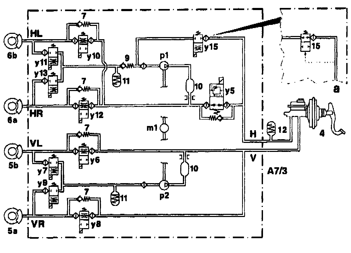 For control a 2/2-way valve for pressure build-up/holding or pressure holding/reducing function are used for each wheel. The self-priming high-pressure/return pump (p1) integrated in the hydraulic unit (A7/3) is used for the ASR/ETS pressure supply. The return pump (p2) which is also integrated is used for return during ABS controls. The suction solenoid valve (y15) on the Bosch version and the intake valve (15) on the Teves version is located in the suction line of the self-priming high-pressure/return pump).