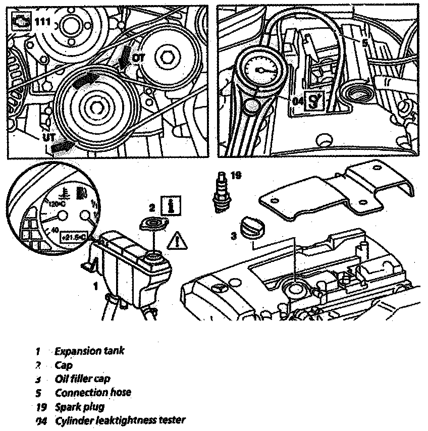 6. Pressurize cylinder with compressed air and read off pressure loss on-tester (04)