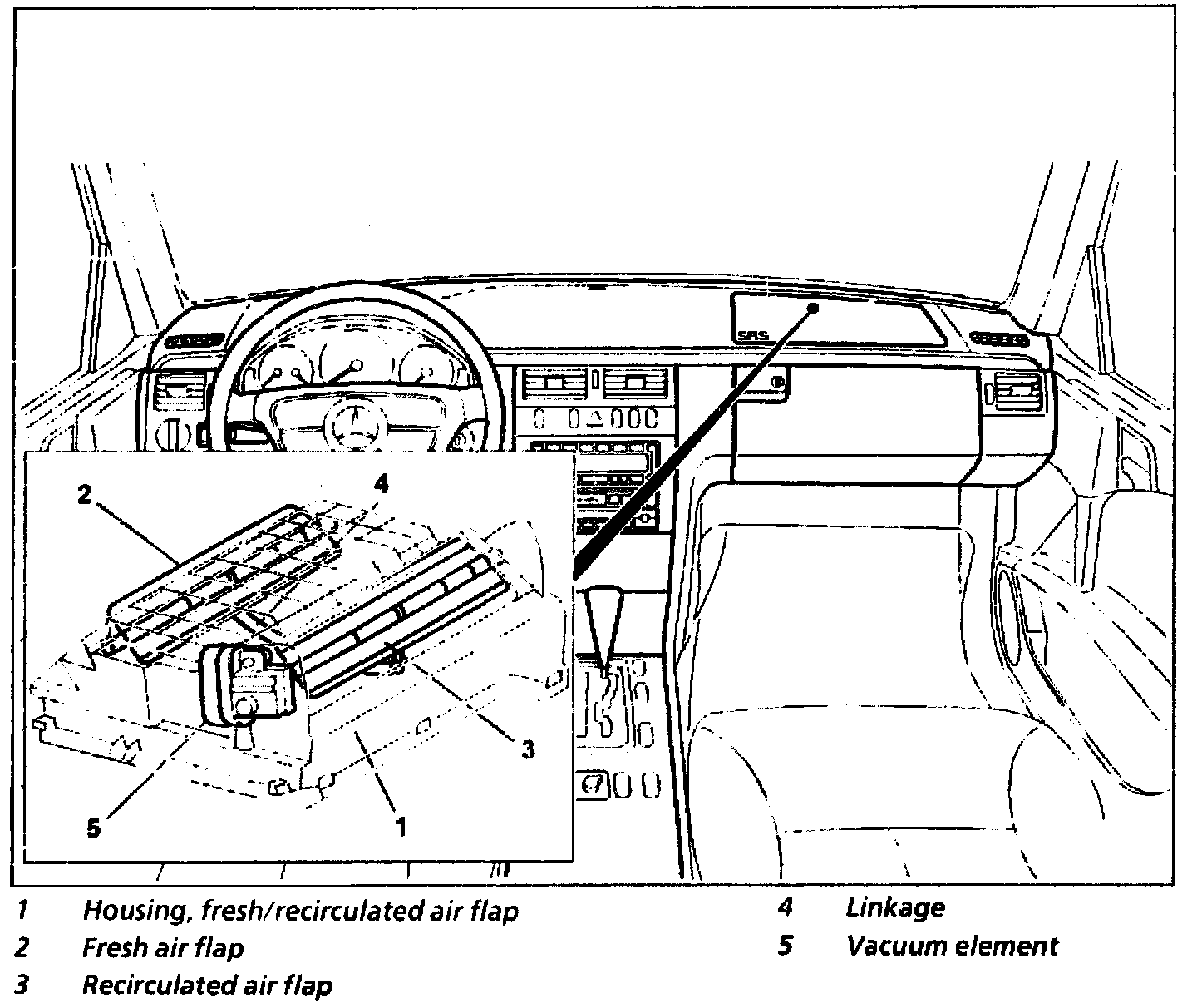 The fresh/recirculated air flap (2, 3) is located behind the instrument panel on the heater or air conditioning housing.