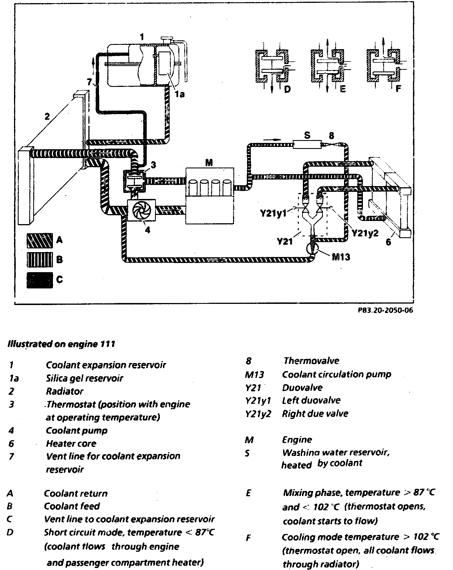 The coolant pump (4) pumps coolant through the engine (M). There the coolant absorbs heat from the engine, heating up the coolant. Then the heated coolant flows through the heater core (6) where the heat is transferred to the air in the passenger compartment. The coolant flowing through the heater core (6) is controlled by the duovalves (Y21y1 and Y21y2) located in the coolant return (A). The coolant can be controlled separately for the left and right sides.