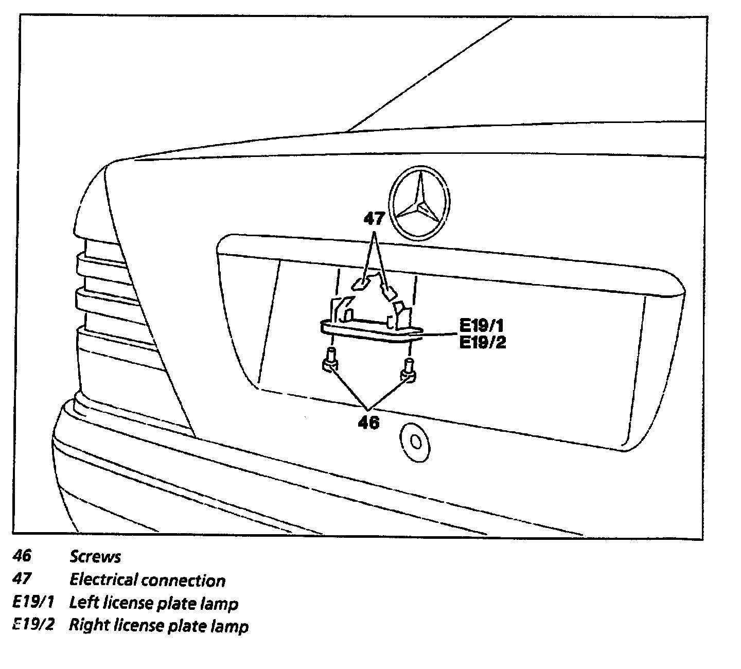 NOTE: The image shows removal of the license plate lamp on model 202 sedan. Removal on the T-model 202 and model 210 and on roadster model 129 is identical.