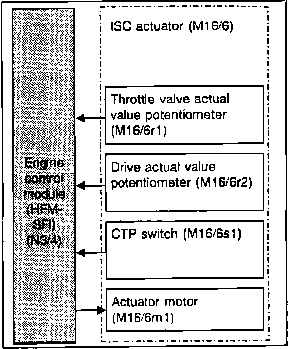 When the ignition switch is in the ON position, idle speed control is in operation. The position of the throttle valve for the idle speed is determined by the control unit. The actual value potentiometer in the idle speed control (ISC) actuator signals the position of the throttle valve. The control module processes various input signals and specifies the position of the throttle valve via the output signal. This signal is used by the ISC actuator to adjust the throttle valve.