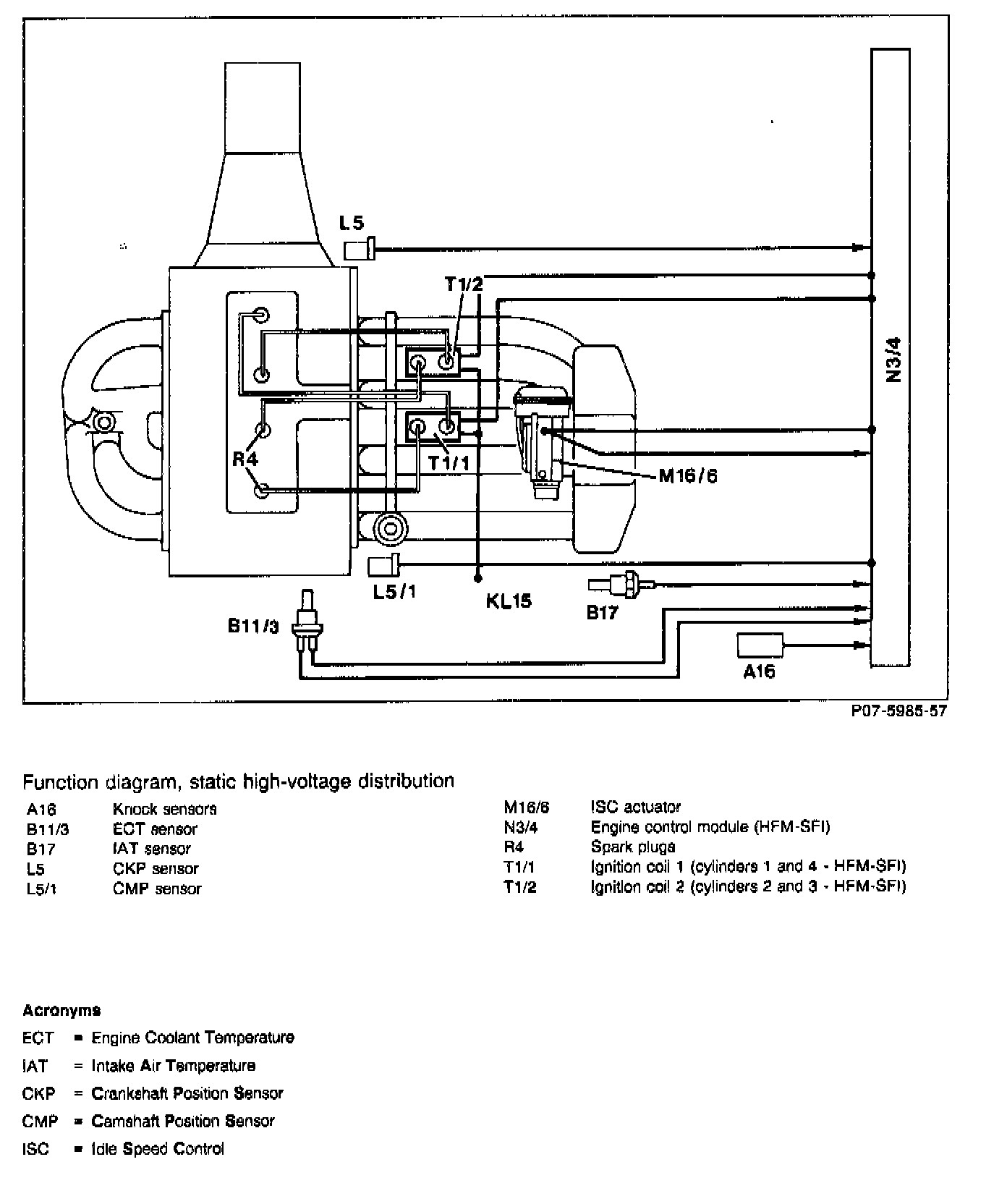 To properly coordinate the ignition timing for each respective cylinder, the ignition firing sequence is synchronized during the engine's first revolutions. The engine control module (N3/4) utilizes the CMP sensor (L5/1) signal to recognize ignition TDC of cylinder 1, and the CKP sensor (L5) (magnet-segment) to recognize ignition circuit 2 (cylinder 2 and 3).