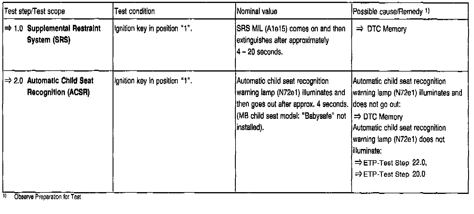 If the automatic child seat recognition warning lamp (N72e1) (AIRBAG OFF) does not go out after approx. 4 seconds, this indicates a fault in the ACSR system.