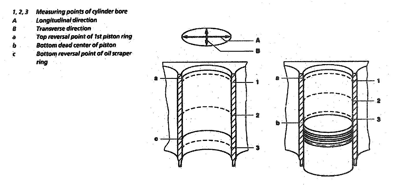 - Measure cleaned cylinder bores with a hole gauge at the 3 measuring points (1, 2, 3) in longitudinal and transverse direction