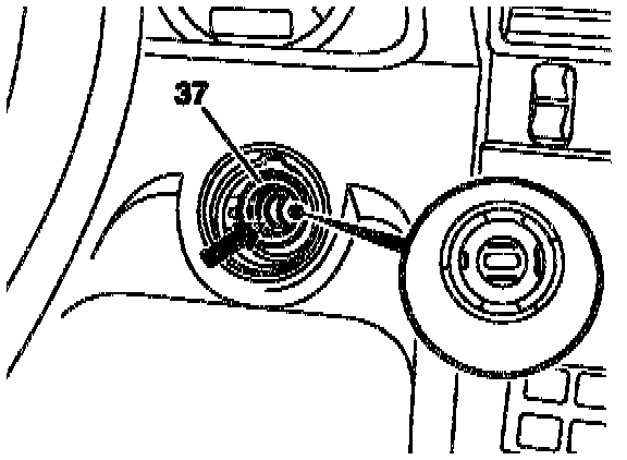 - Align indentations (arrow step 4 of Removal) in the lock cylinder (36) with the recesses in the steering lock (arrow)