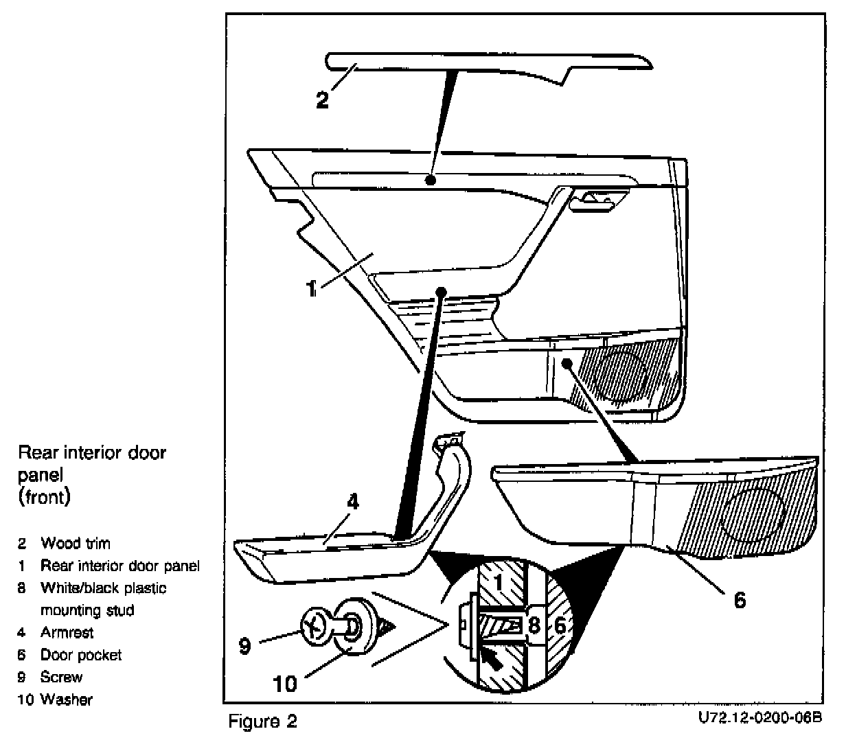 6. Temporarily insert armrest and door pocket into door panel. Using cutting pliers trim off any excess length of the white/black plastic mounting stud, which protrudes beyond the thickness of the interior door panel. The ends of all the white/black plastic mounting studs are to be flush with the back side of the interior door panel (arrow, enlargement, Figure 2).