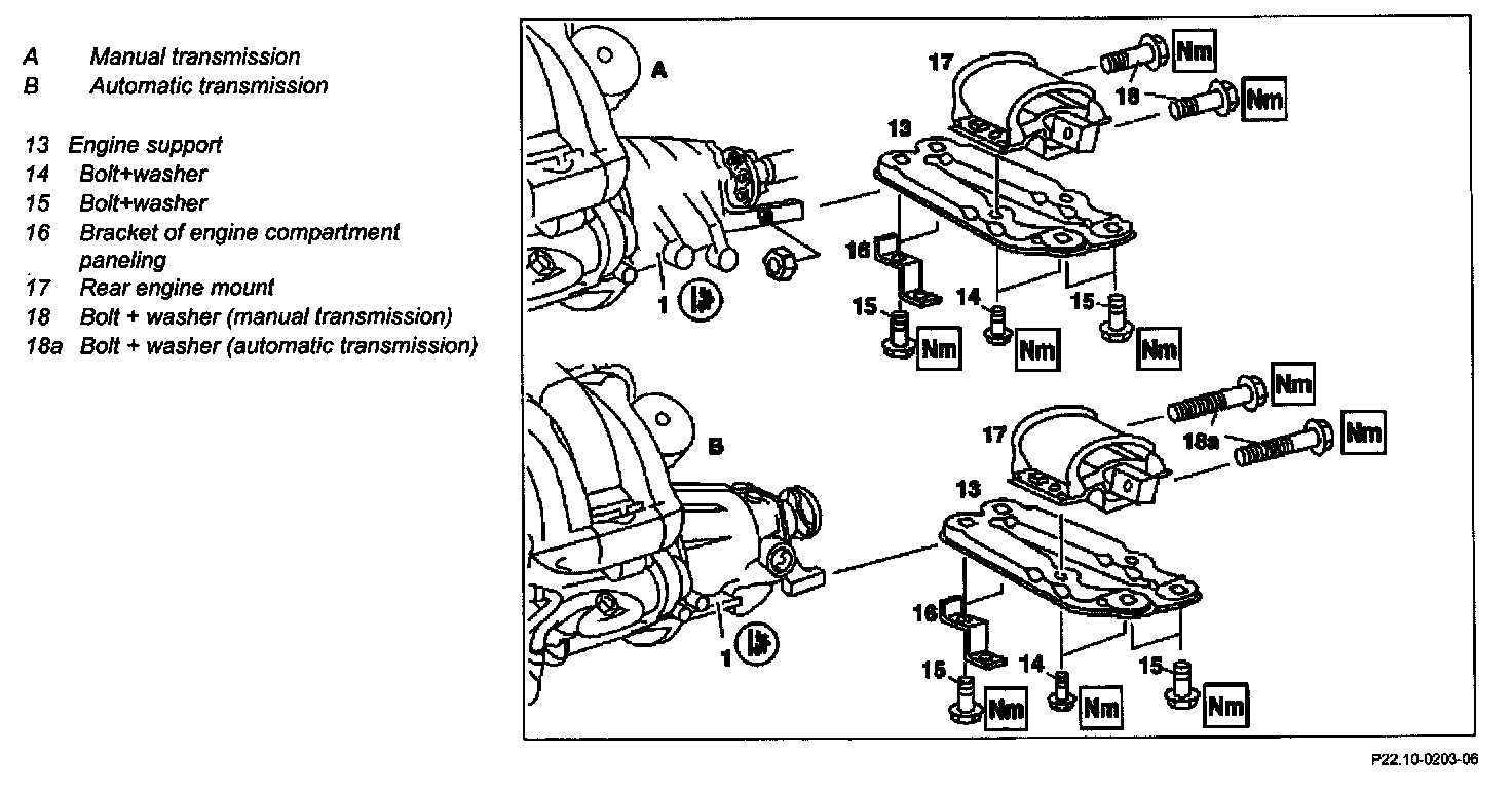 2 Unbolt engine cross member (13) at rear