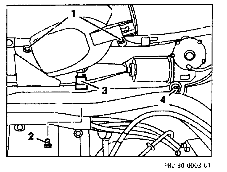 2. The distance from wiper gear head to windshield can be adjusted by slacking the bolt (2). Wiper arm must be in vertical position.