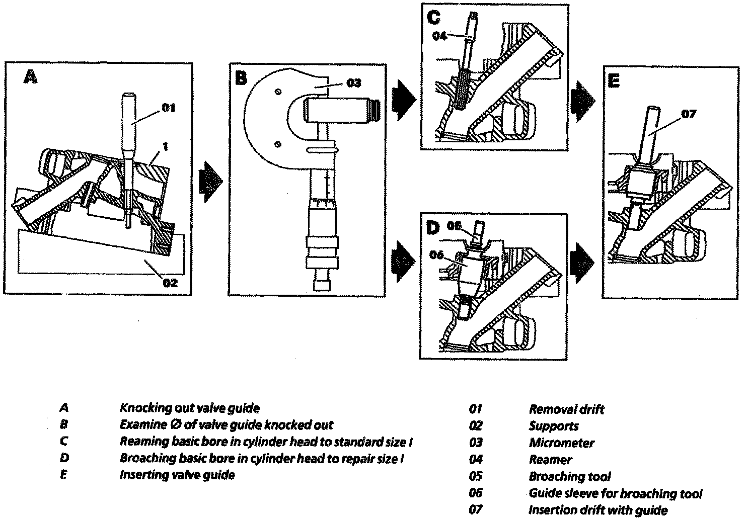 - Use drift (01) tool No. 606 589 00 15 00 for 6 mm guides or tool No. 111 589 02 15 00 for 07 mm guides, or equivalents, to knock out valve guides (54) from the combustion chamber end