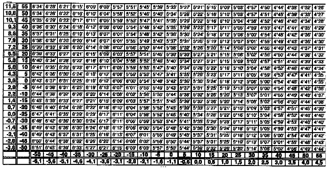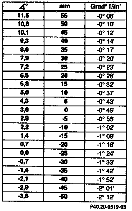 - Using front and rear axle level measurements, obtain the front axle caster value from the table (measured with wheels turned 20°).