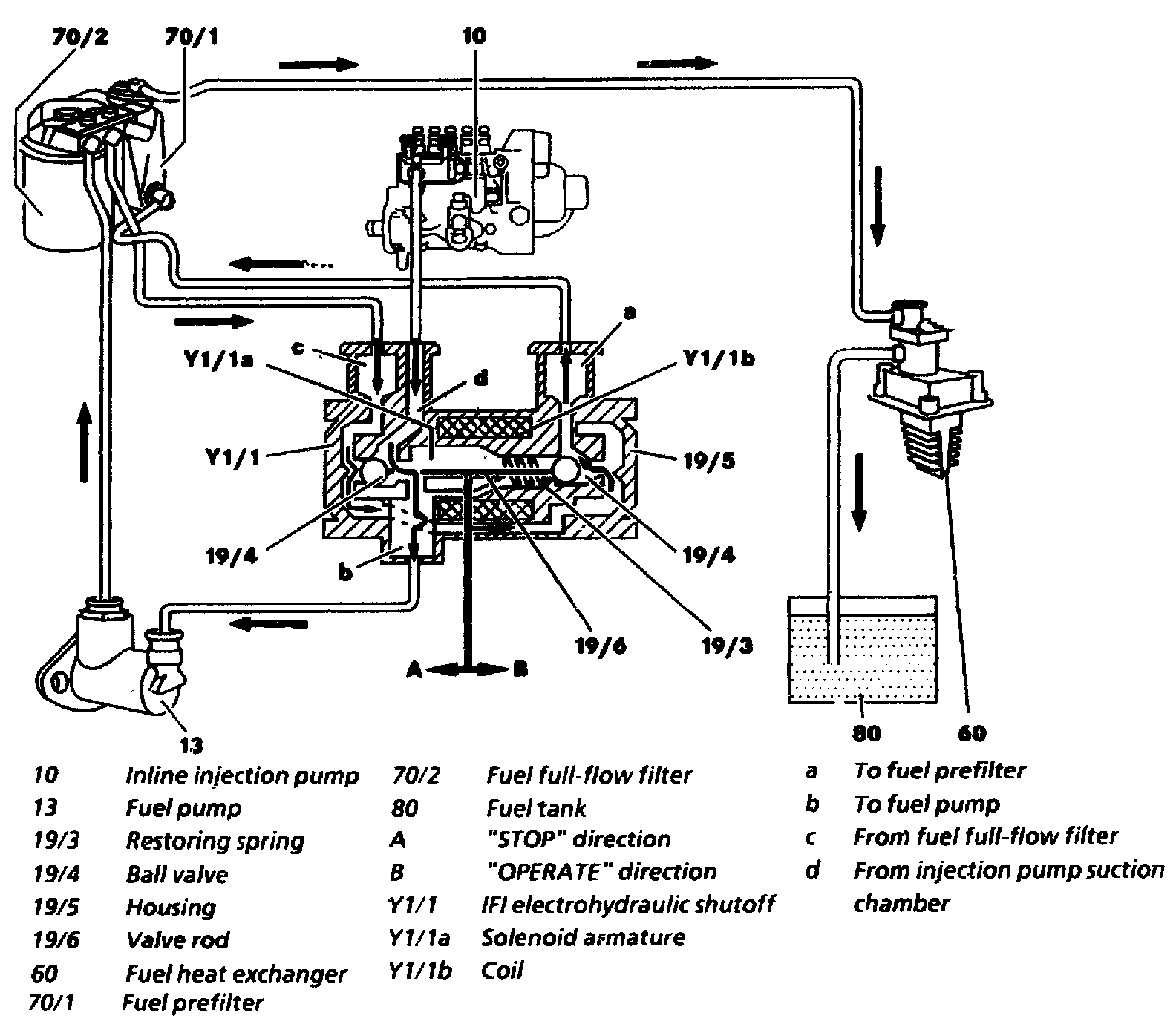 The fuel drawn off is pumped back through the fuel full-flow filter (70/2), the IFI electrohydraulic shutoff (Y1/1), the fuel prefilter (70/1) and the fuel heat exchanger (60) into the fuel tank (80).