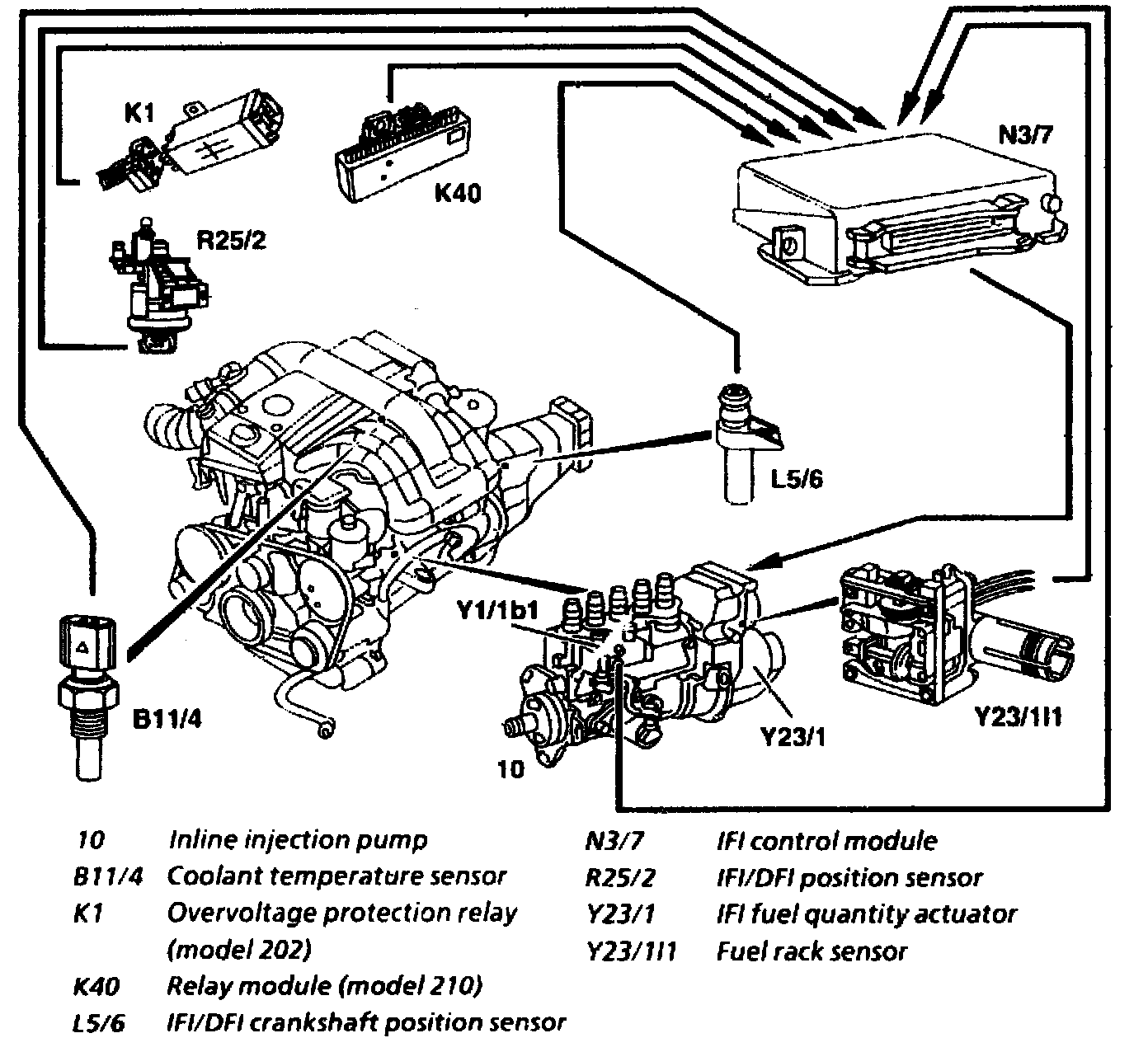 The IFI/DFI crankshaft position sensor (L5/6) supplies an alternating voltage signal to the IFI control module (N3/7). The control module calculates the engine speed conducts a set/actual value comparison and control the specified engine speed through the IFI fuel metering control (Y23/1) and the control rod.