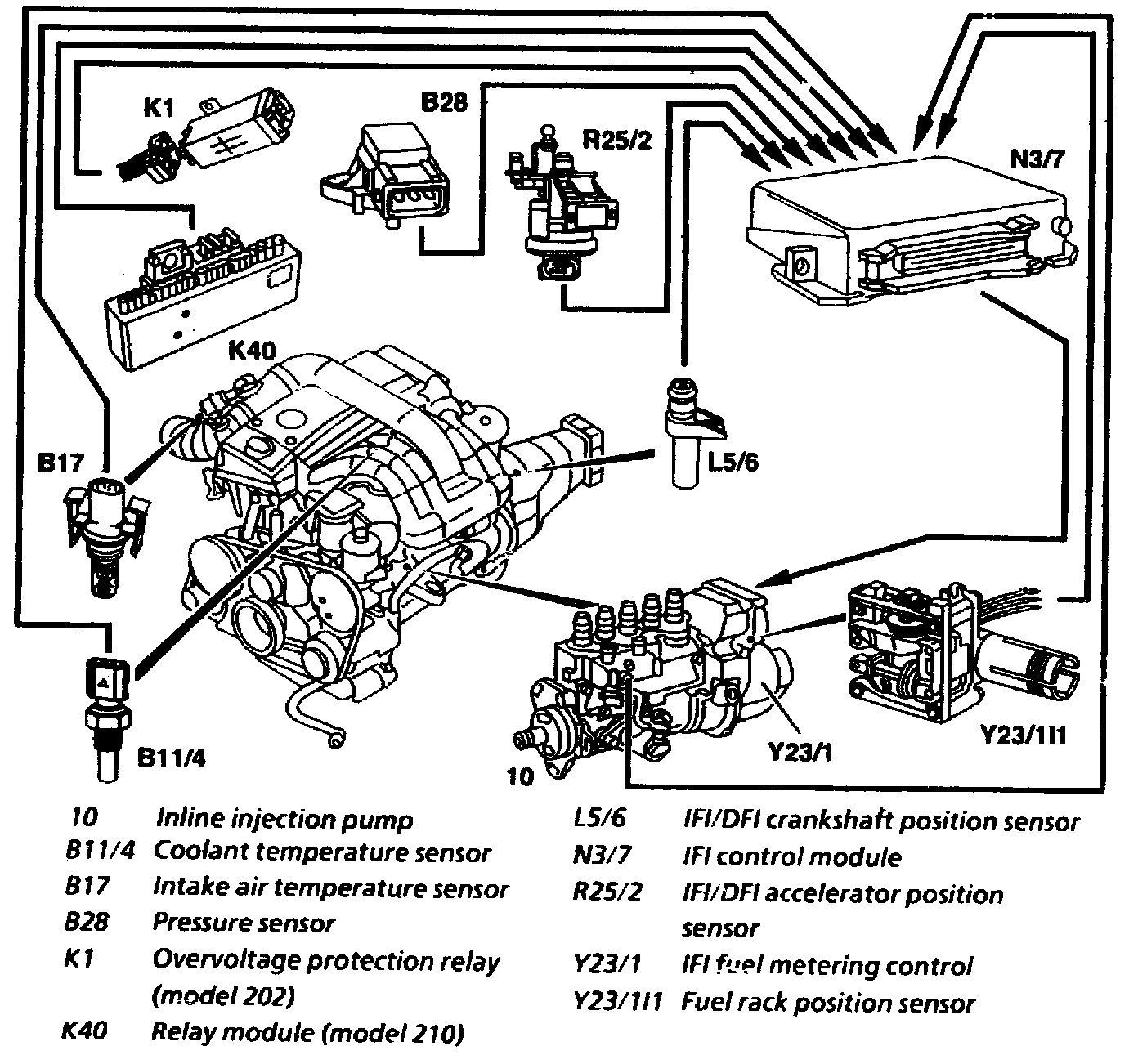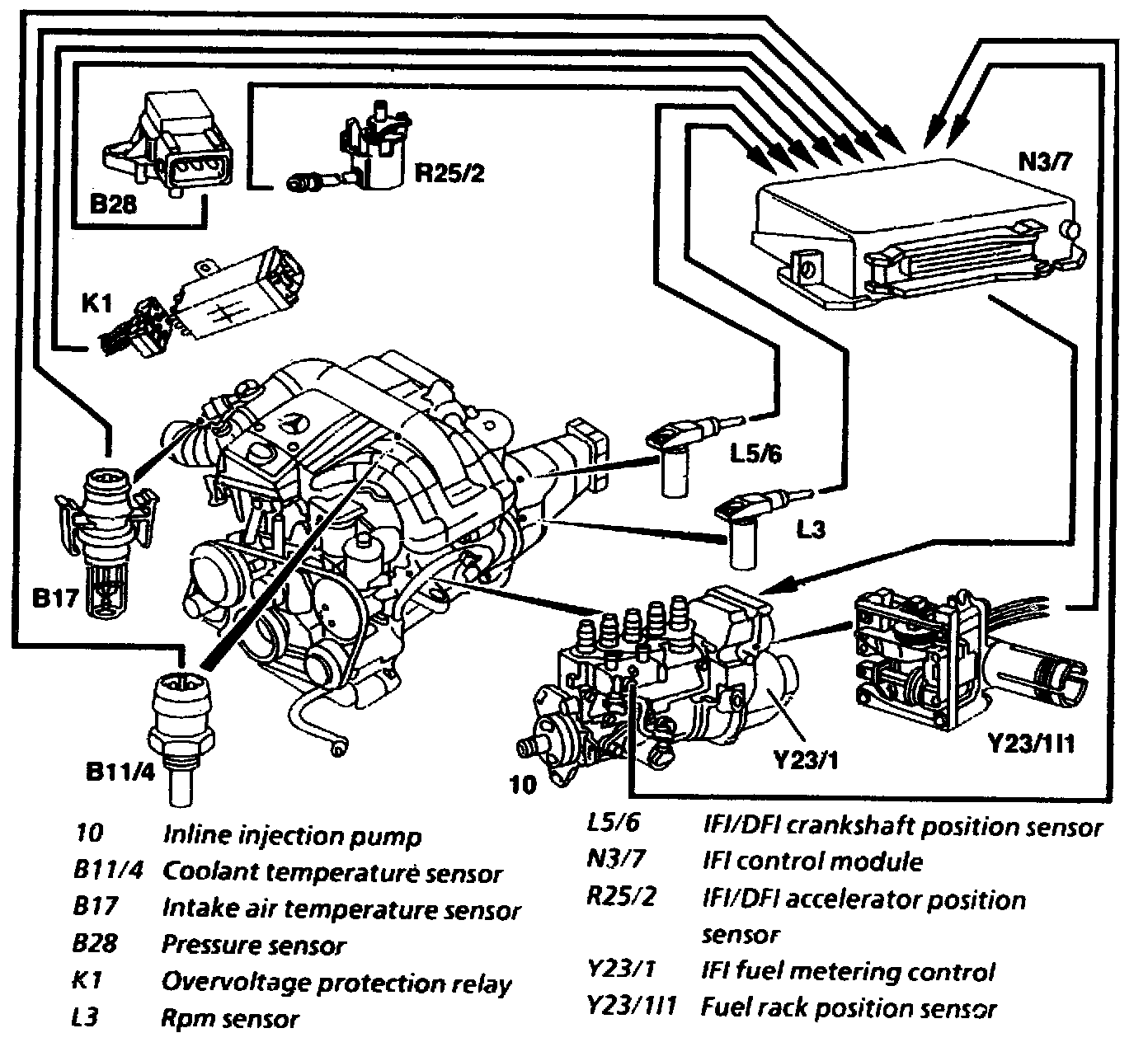 The IFI control module (N3/7) receives the required input signals from the components listed below and regulates the quantity of fuel through the IFI fuel metering control (Y23/1) and the fuel rack.