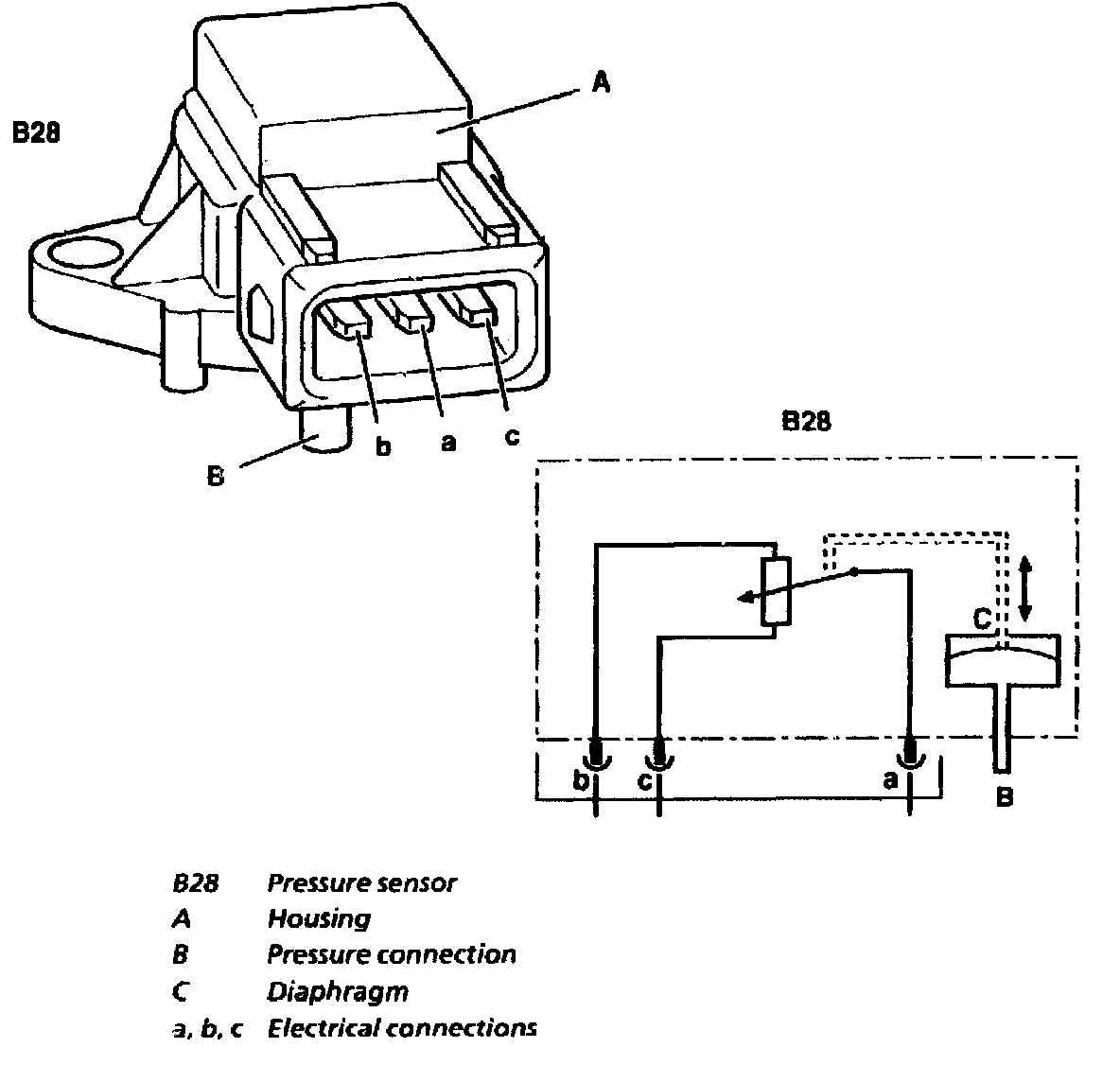 The pressure in the intake manifold/charge air distribution pipe alters the shape of the diaphragm and the piezo resistors alter their resistance. This influences the output voltage which in turn is used by the engine control module as information regarding the pressure in the intake manifold/charge air distribution pipe. The intake manifold/charge air distribution pipe pressure is required for the following funtions: