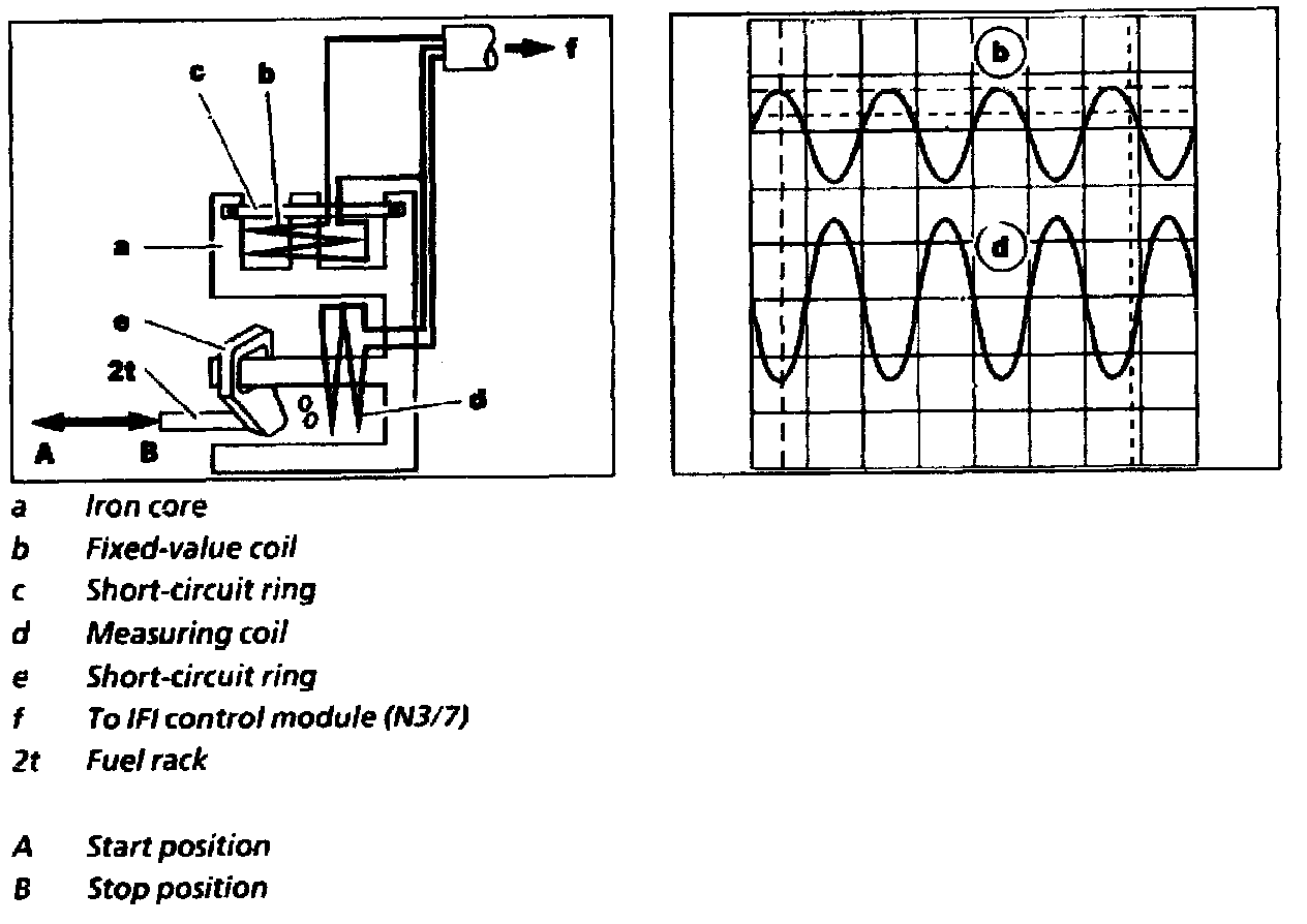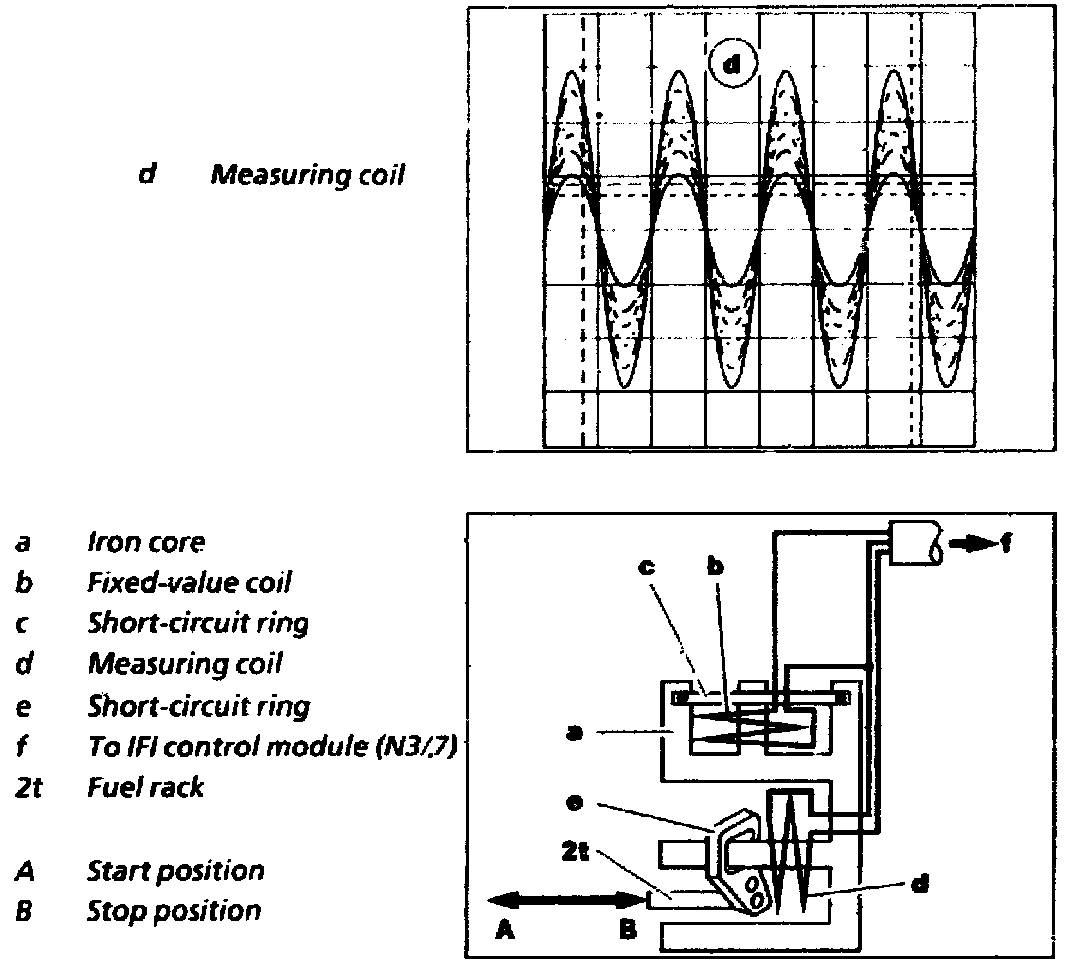 The fixed-value coil (b) is actuated by the IFI control module (N3/7) with a frequency of 10 kHz and a pulsating D.C. voltage (about 1.5 V). The short-circuit ring (e) of the fuel rack (2t) moves away from measuring coil (d). As a result, the magnetic field (inductance) of the measuring coil (d) is built up to a maximum (2.8 V). The voltage drop of the measuring coil (d) is thus at its minimum.