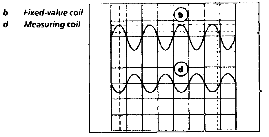 During inertia fuel shutoff (zero delivery, 0 mm travel), the short-circuit ring (e) of the fuel rack (2t) moves toward the measuring coil (d) in direction "B". As a result, the magnetic field is reduced (1.6 V). The voltage drop through the measuring coil (d) is thus at its maximum.