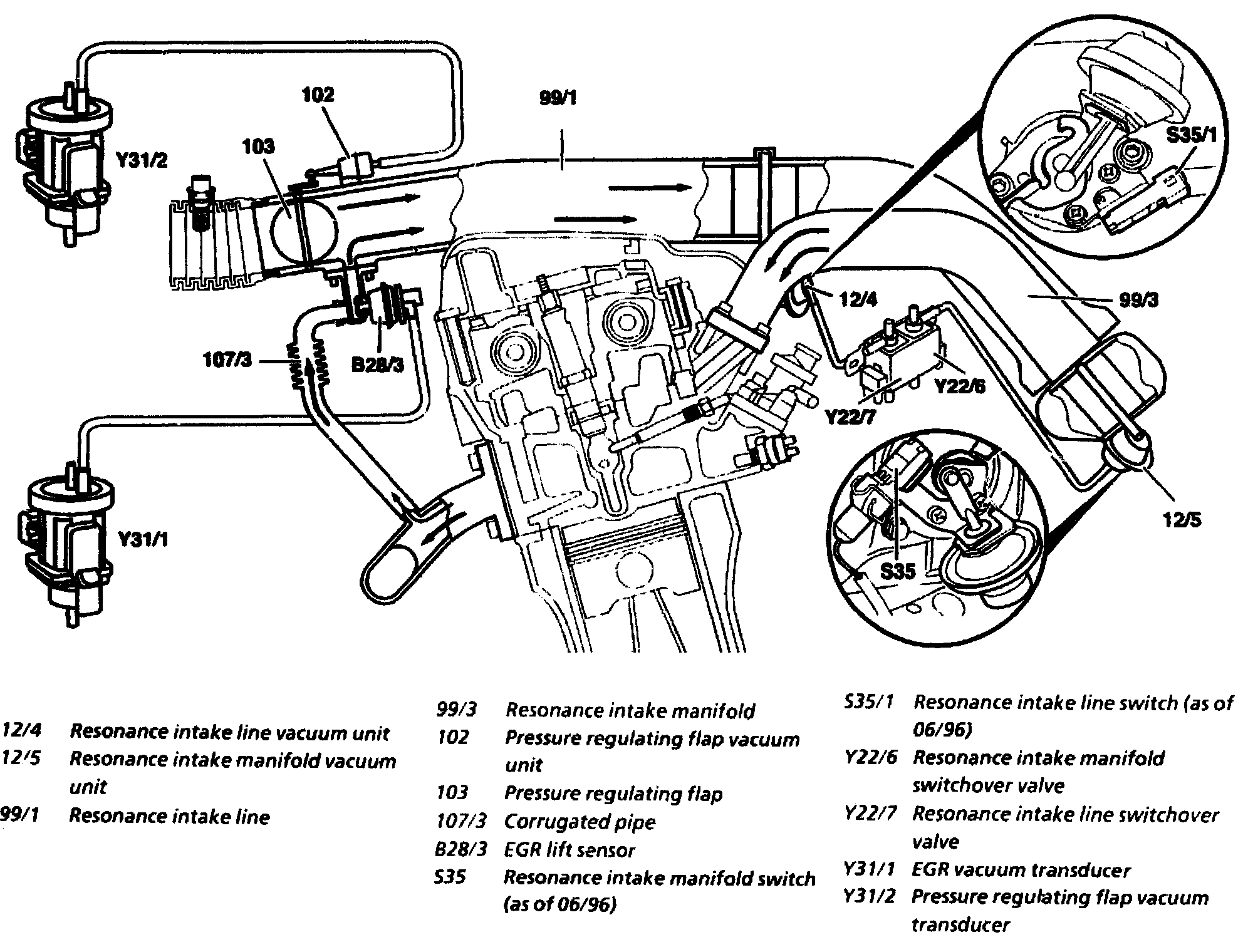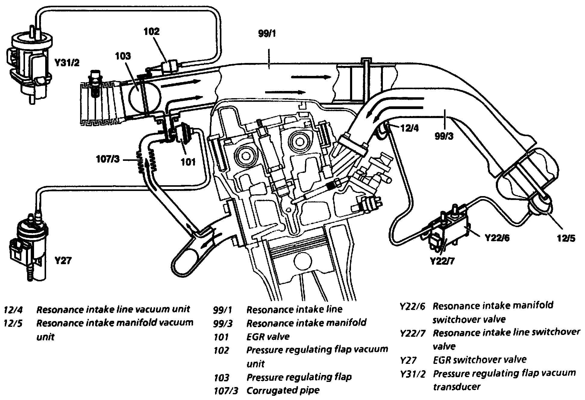Model 210.020 (USA) : The EGR vacuum transducer (Y31/3) is actuated at the ground side and regulates the vacuum to the EGR lift sensor (B28/3), as a result of which this is opened.