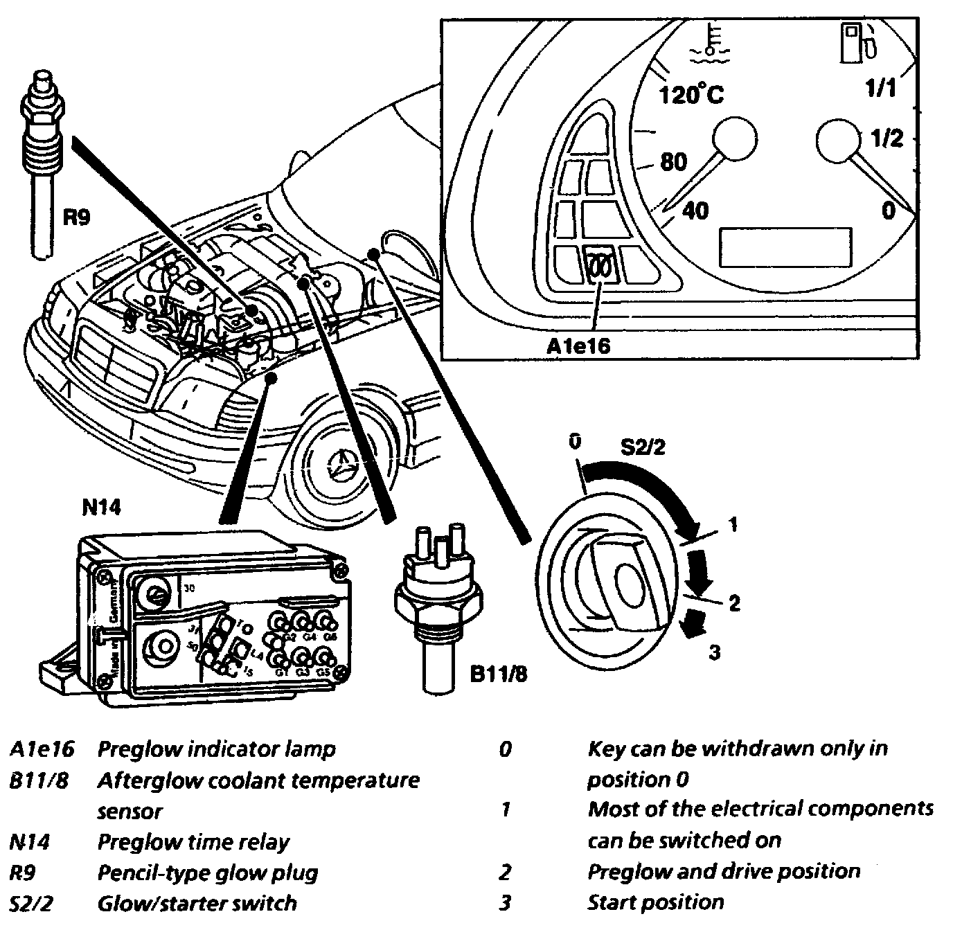 When the glow/starter switch is switched on (S2/2, position 2), the preglow time relay (N14) is actuated through terminal 15. The preglow time relay (N14) actuates the pencil-type glow plug (R9) and the preglow indicator lamp (A1e16) in line with the coolant temperature which is detected by the afterglow coolant temperature sensor (B11/8). Once the required preglow time has been reached, the preglow indicator lamp (A1e16) goes out and thus indicates ready to start.