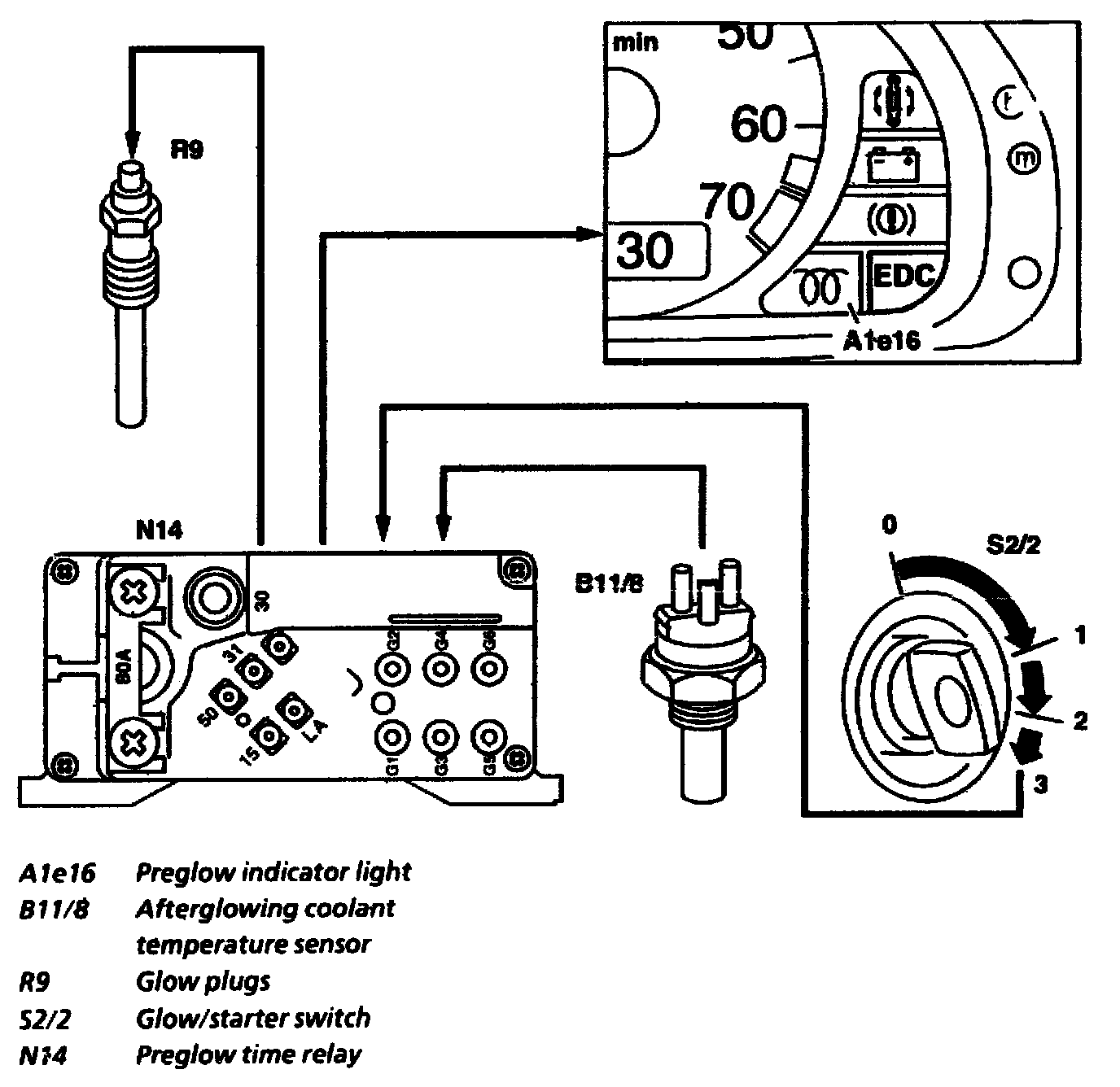 Startglowing is commenced by turning the glow/starter switch (S2/2) to position 3. The preglow time relay (N14) is supplied with a signal through circuit 50 and is started. Consequently, voltage continues to be supplied to the glow plugs (R9) so long as voltage exists at circuit 50.