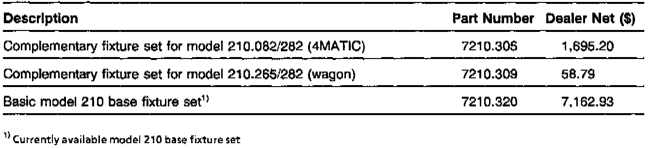 Due to a modification in the rear body crossmember of models 210.265/282 (wagon), a complementary set of revised bolts (71, Figure 3) is now available. This is a complementary set to be used with the existing model 210 fixture sets 7210.300, 7210.310 or 7210.330.