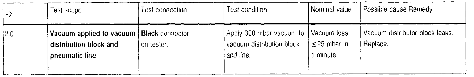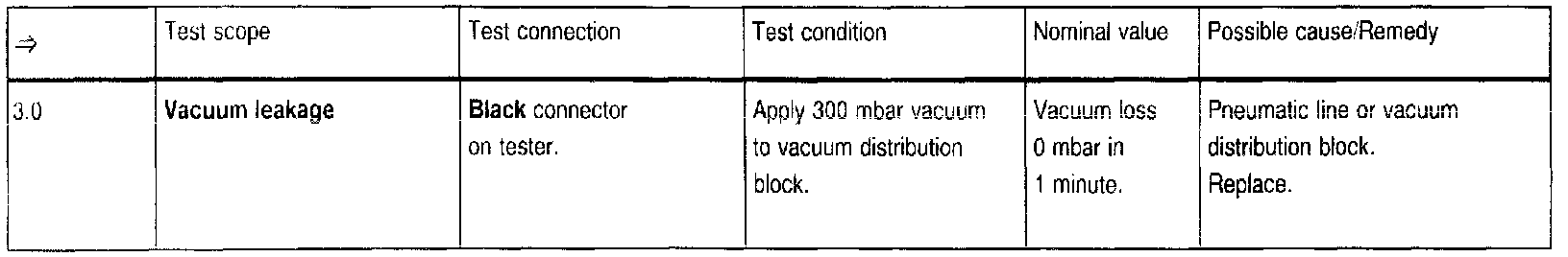 Allowable leakage of pneumatic lines and vacuum distribution block at 300 mbar vacuum in 1 minute. Permissible deviation <=30 mbar.