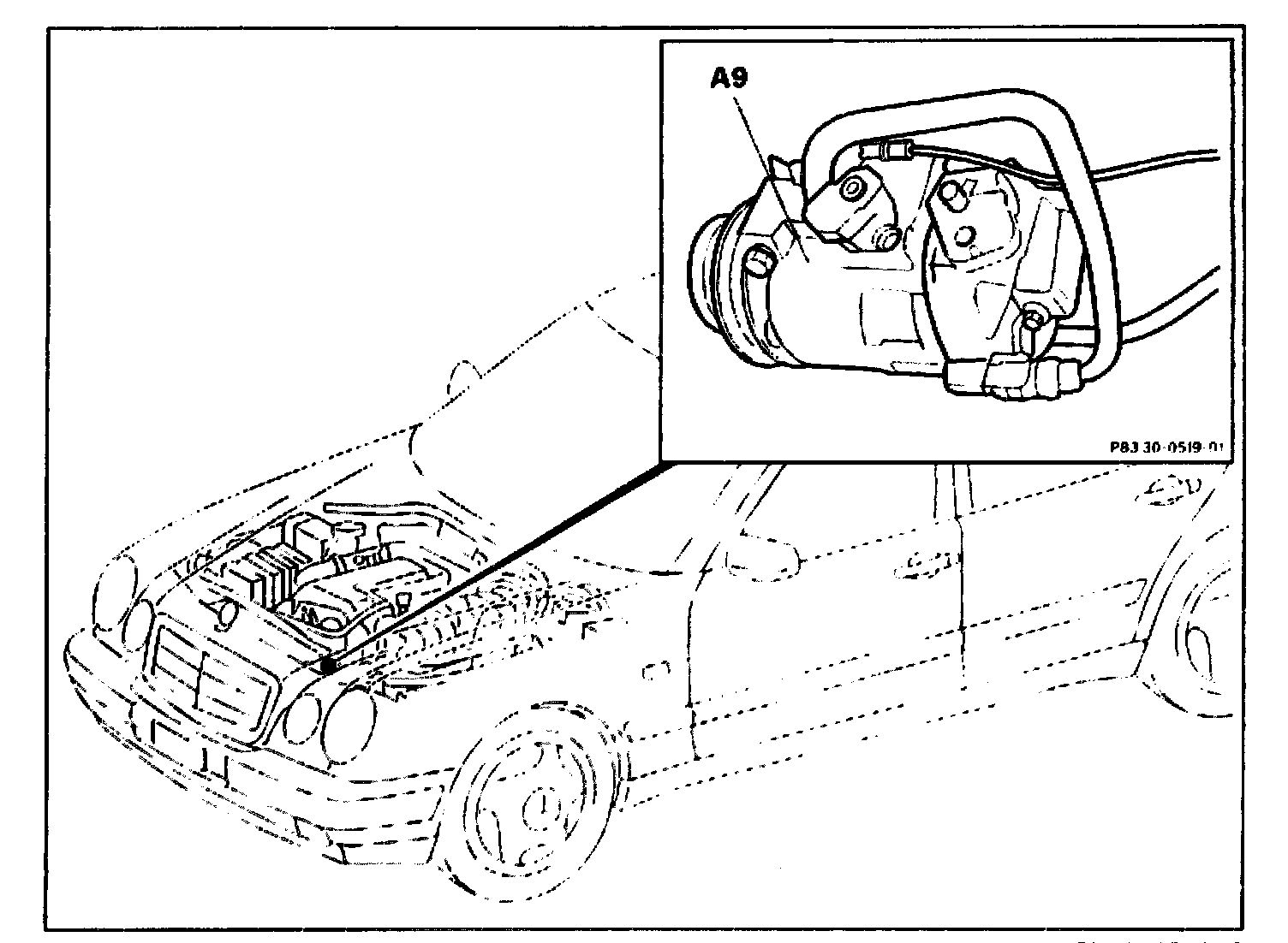 The A/C compressor (A9) is attached to the engine at the front left.