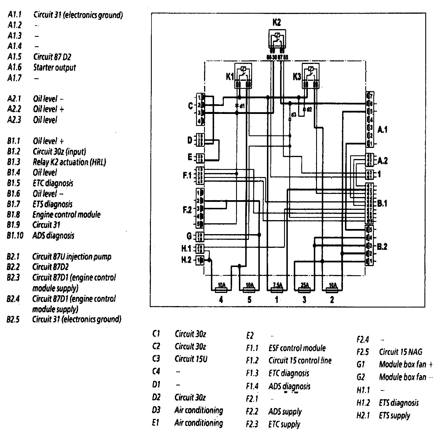 With ignition OFF actuation is cancelled, but voltage continues to be supplied for about a further 4 seconds through contact B1.3 to the fuse and relay module (K40/4) by means of the holding relay circuit in the engine control module. The engine control module detects the voltage drop at circuit 15 and initiates engine stop.