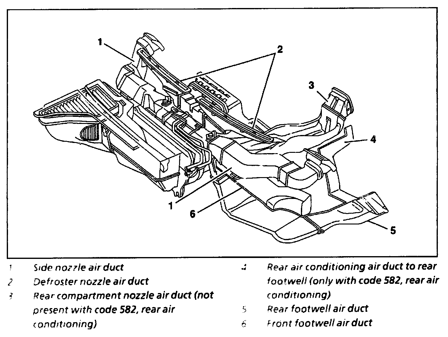 (1-6) guide the air required for ventilation of the vehicle from the automatic A/C housing to the air outlets in the vehicle passenger compartment.