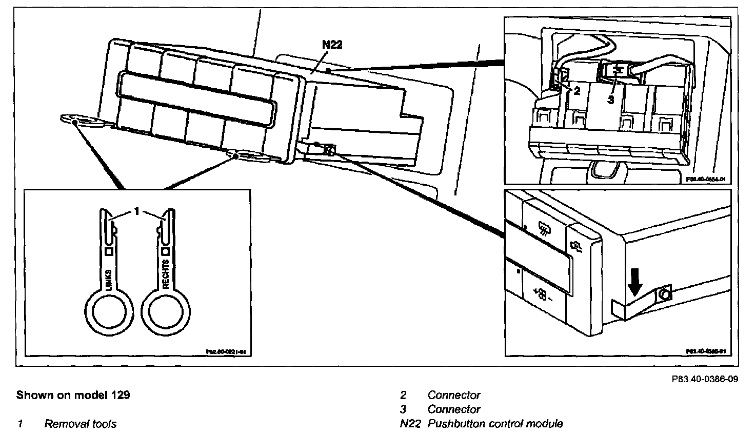 - Press back retaining springs (arrow) on removed pushbutton control module and pull out removal tools (1).
