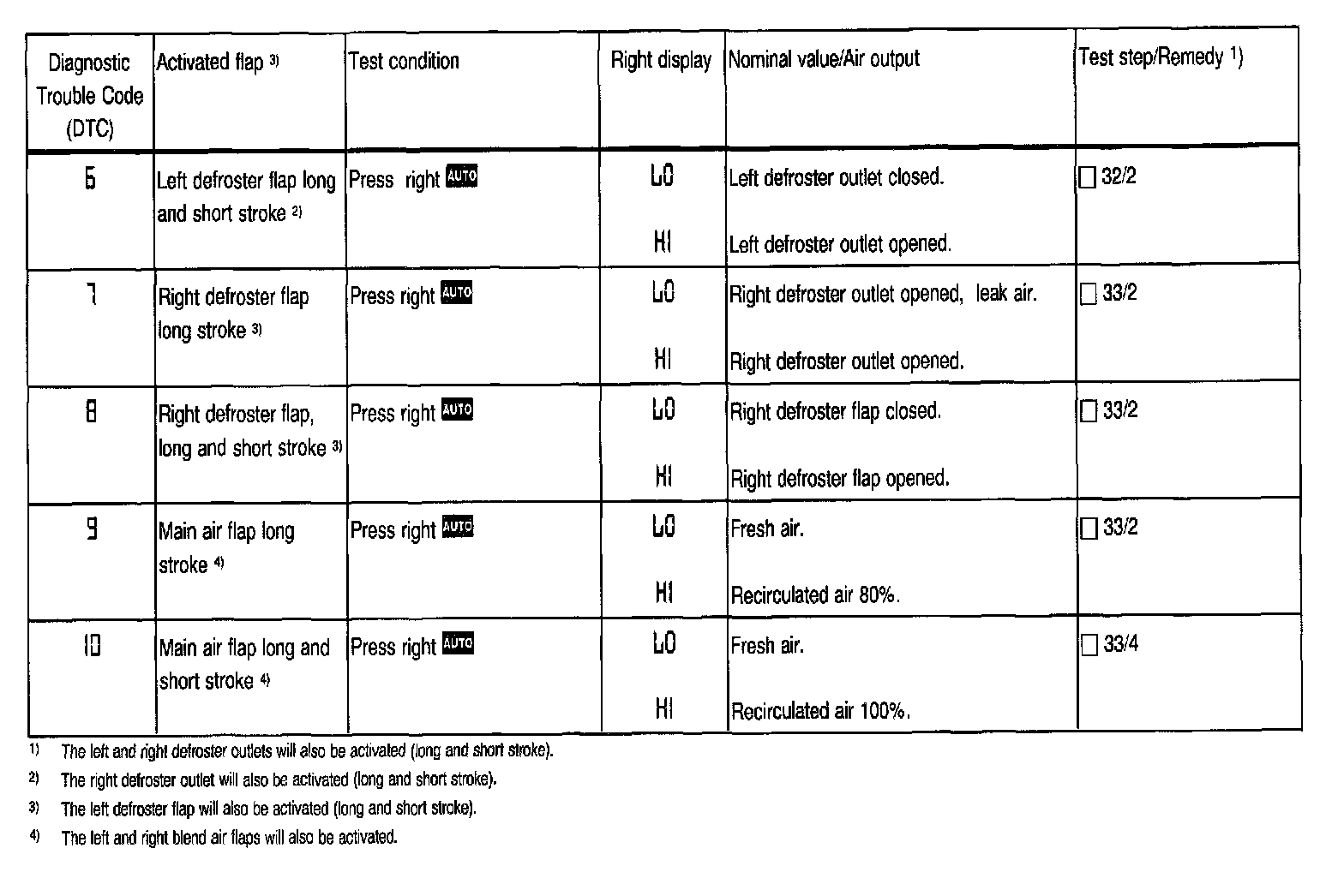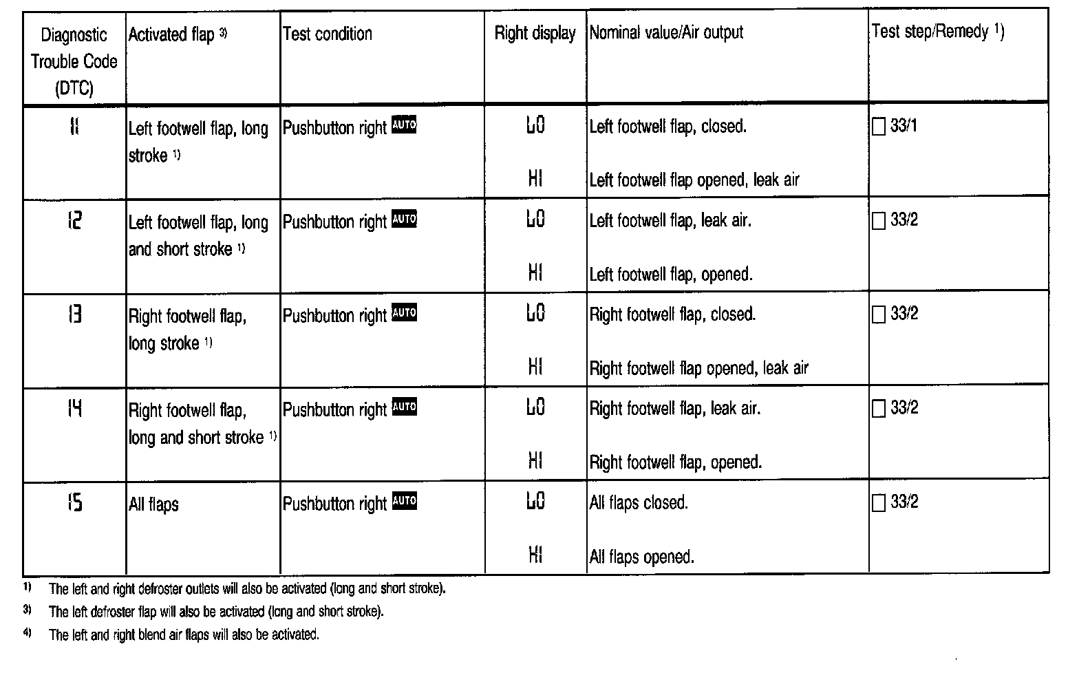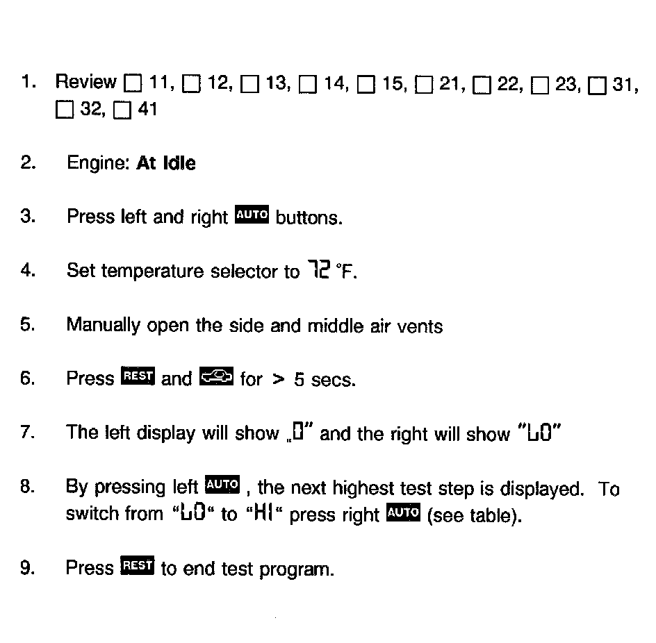 1. The display window in the A/C pushbutton control module (N22) will show the test step. Pressing the various buttons will activate the individual vacuum actuators. The LED on the depressed button lights up.